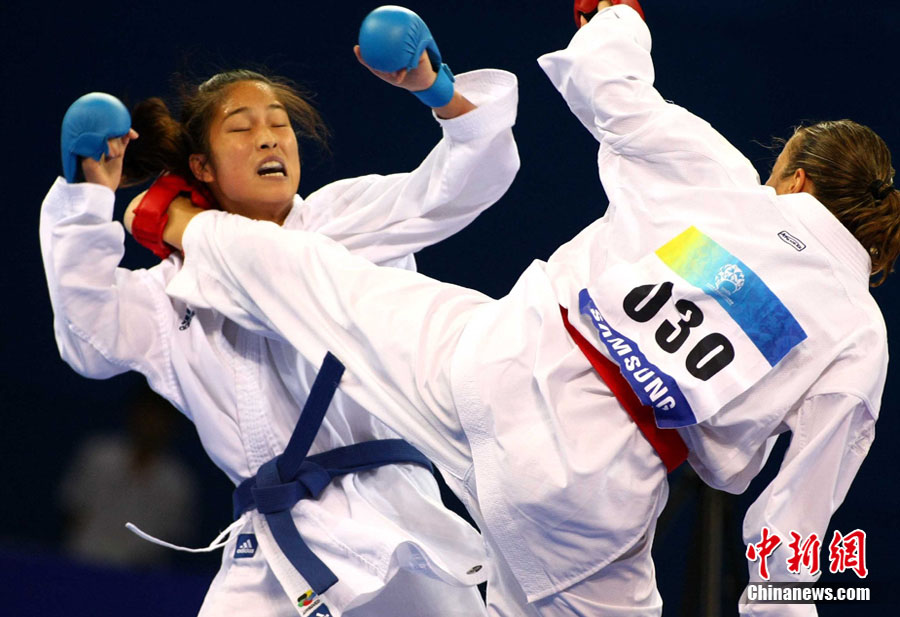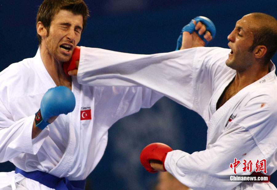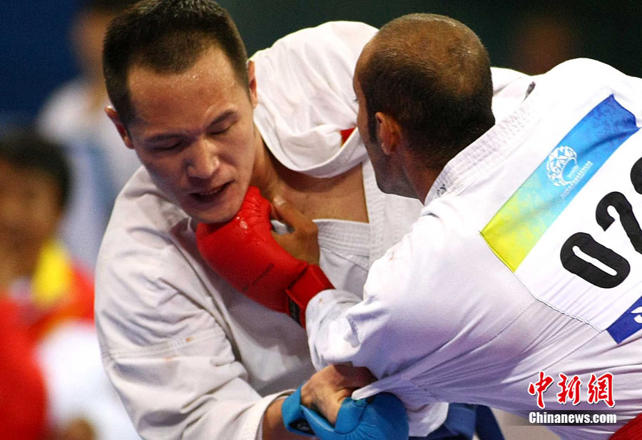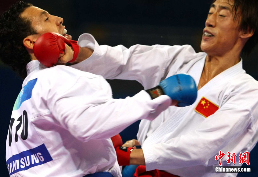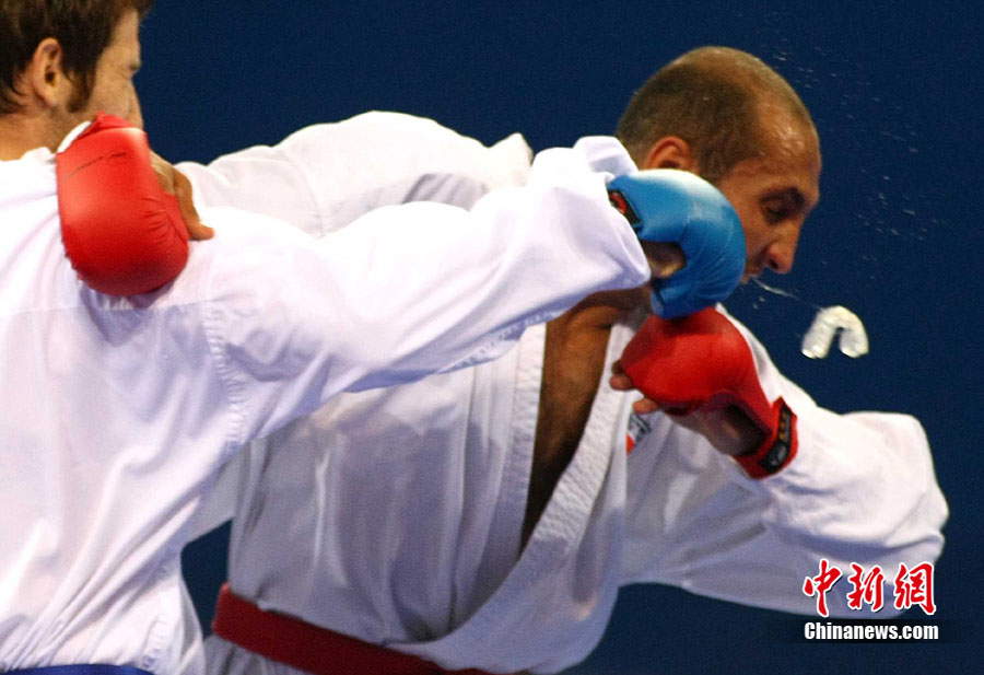 8月31日,2010年北京首屆世界武搏運動會空手道項目在北京科技大學體育館展開首日爭奪。圖為在一場比賽中,中國隊許祥伍被伊朗選手法羅希(Farrokhi)擊中面部。