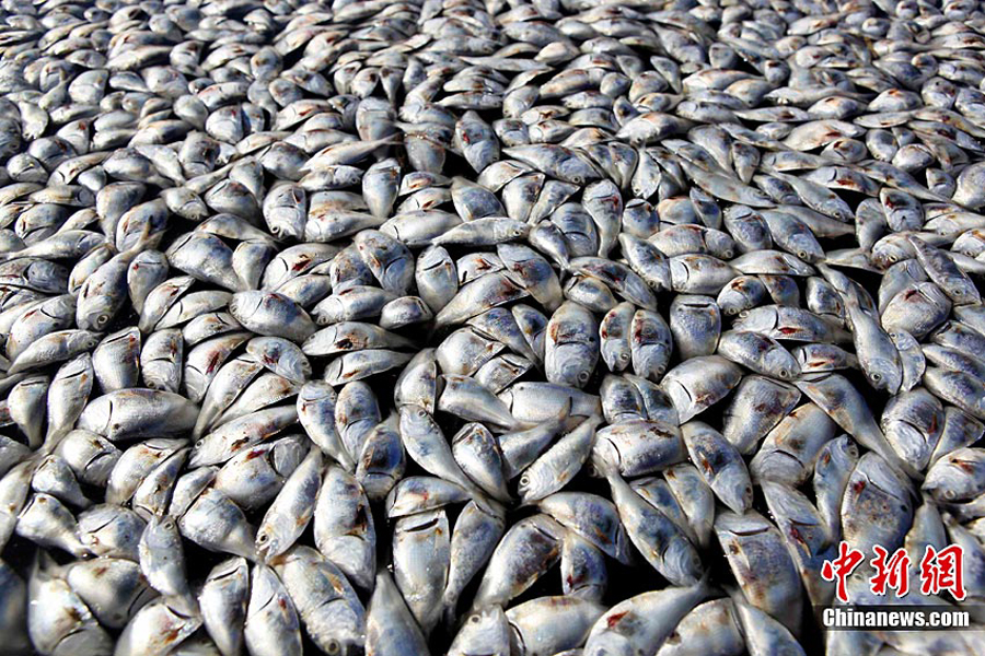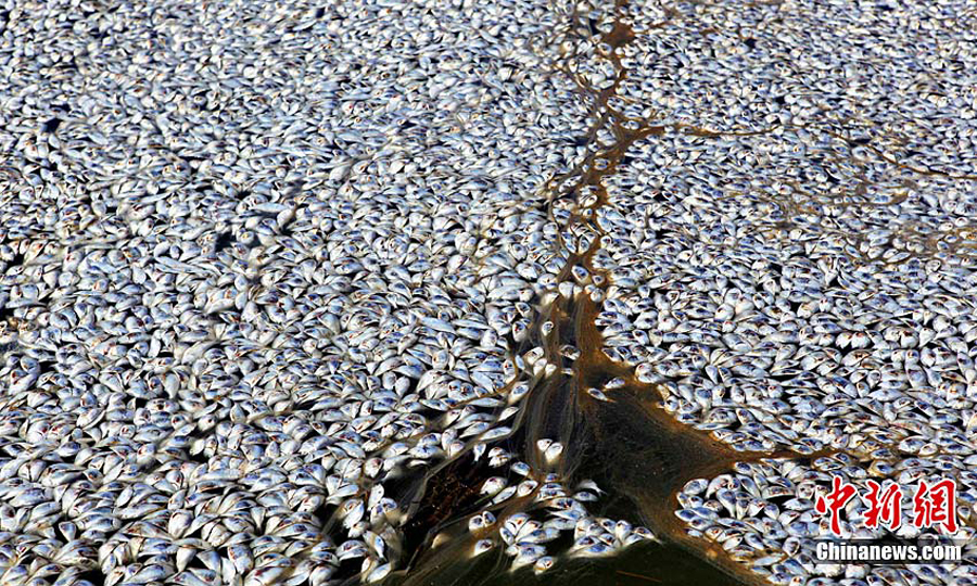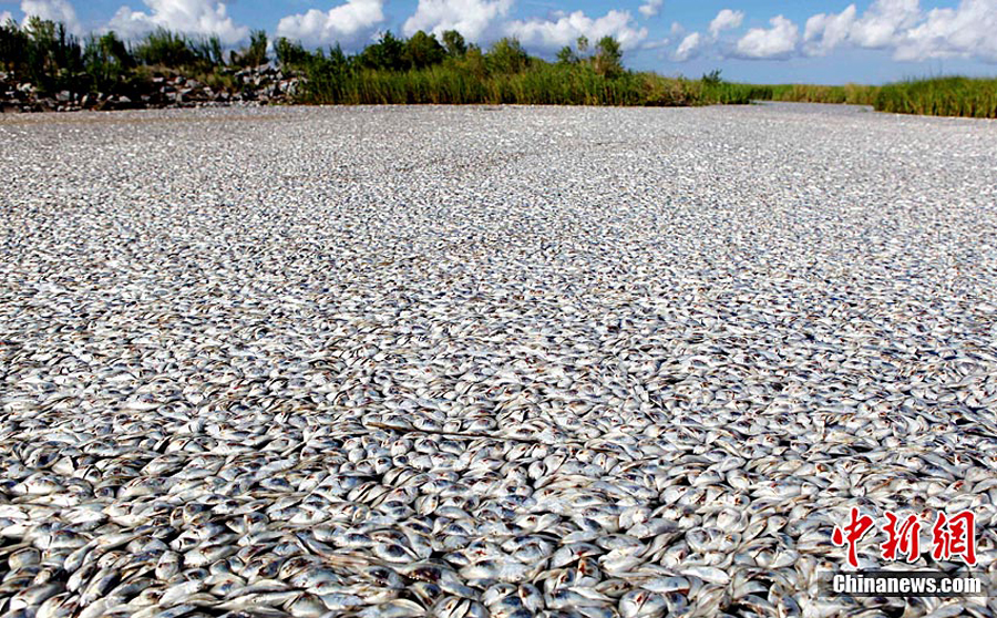近日,人們在美國路易斯安那州普拉克明縣發現大批漂浮在緩流溪上的死亡魚群。目前,這批魚的死亡原因不明,但懷疑與墨西哥灣漏油事件有關。圖為9月10日在美國路易斯安那州普拉克明縣拍攝的大批死魚。