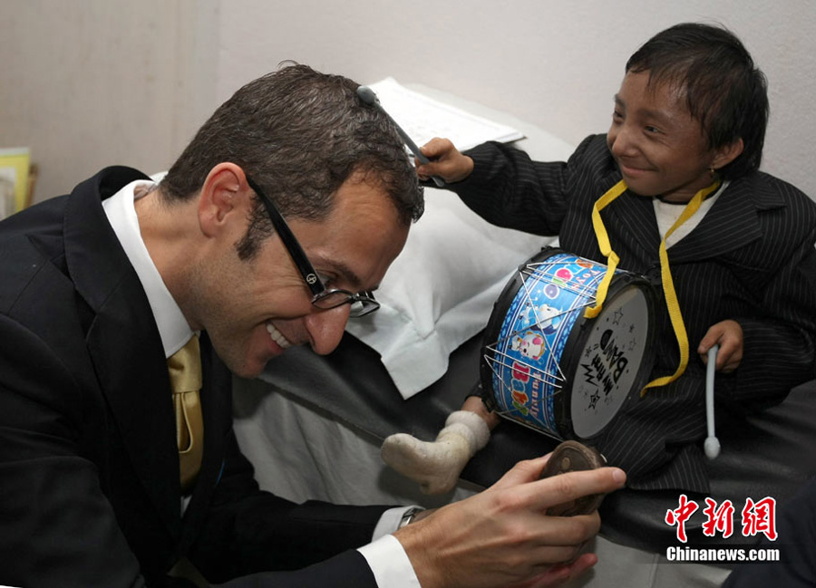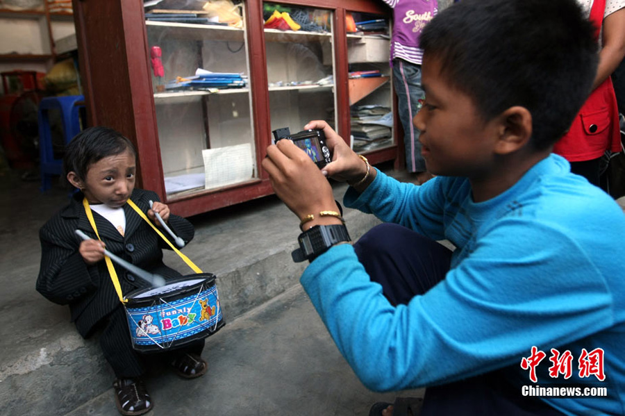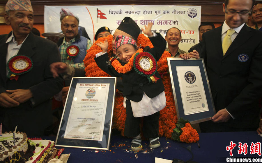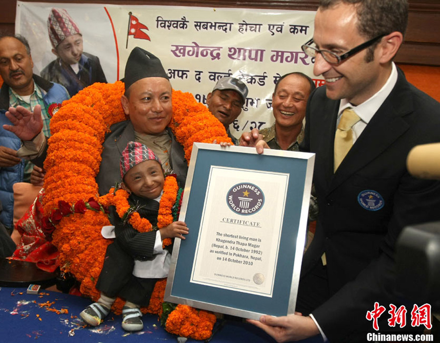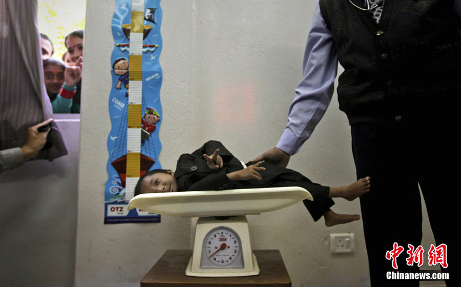 10月14日,在尼泊爾中部小城博克拉,一名尼泊爾醫生在《吉尼斯世界紀錄大全》工作人員的見證下為18歲的卡根德拉·塔帕·馬加爾測量身高。馬加爾出生于1992年10月14日,現在身高65.53厘米,體重5.45公斤。今天,馬加爾成年,從而打破全球成人最矮身高紀錄。