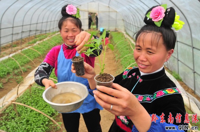 凱里市三棵樹鎮賞郎村苗族村民在辣椒苗圃里正在將辣椒苗移植放入營養袋