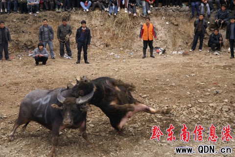 本港訊 (記者 楊驥 攝影報道)3月5日,2010中國·凱里甘囊香國際蘆笙節(jié)民間斗牛賽繼續(xù)在甘囊香斗牛場進行,來自雷山縣郎德的29號牛“斗士”在比賽中兵不血刃,三場比賽中均將對方扣倒在地制勝,一舉奪得冠軍。更令人驚訝的是,這三場比賽用時加起來竟然不到一分鐘。