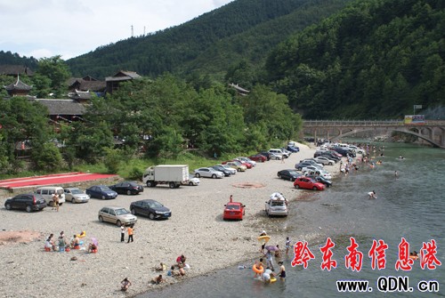 由凱里市的南花村、季刀、懷恩堡、龍井、寨瓦和雷山縣郎德、貓貓河、南猛、腳猛等8個村寨組成的巴拉河鄉村旅游示范項目區,2003年以來先后被列為全省鄉村旅游示范區和全國農業旅游示范點。為打造“巴拉河鄉村旅游示范帶”品牌,凱里市于7月23日以來舉辦凱里·巴拉河消夏旅游節系列活動,活動期間的項目有民族歌舞表演、啤酒大賽、打糍粑、篝火晚會、苗寨風情體驗等。詩情畫意的自然風光,純樸多姿的民風民俗,吸引了重慶、湖南、貴陽、凱里及周邊縣市的游客。據了解,自活動開展以來,光寨瓦日均接待游客500人次,最多可達1500人次。圖02137為凱里市巴拉河寨瓦旅游火爆的場景。