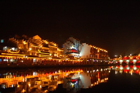 若是有興致,大可登船夜游,參與游船文藝演出,聽苗家土歌,看被燈光渲染得光怪陸離的水面,和兩岸飄忽的人聲燈影,切身領略現代聲光與古鎮原生態文化交相融合的精美畫面,感受天水相連,火樹銀花不夜天的華麗場面。