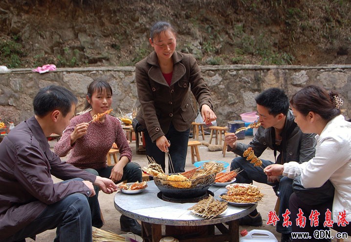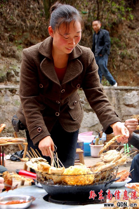 烤魚大嫂名叫劉俊,今年31歲,此前從鎮遠縣城的大菜園嫁到該縣涌溪鄉中屯村匏瓜(“桃花島”景點)寨。桃花島位于舞陽河畔,游船經過這里的時候,導游都要對它作一番介紹。生活在這里的人們除了種地,就經常下河去打魚撈蝦。10多年以前,舞陽河旅游興盛,桃花島的群眾因地制宜,在景區入口處做起了烤魚生意。大嫂嫁到桃花島后,也擺起攤子烤起了魚。這一干,就是9年。