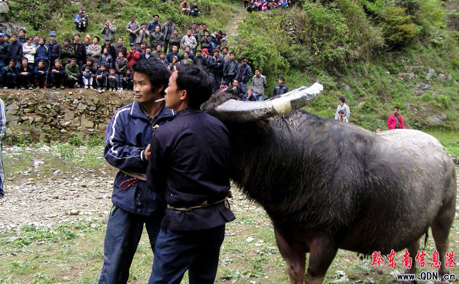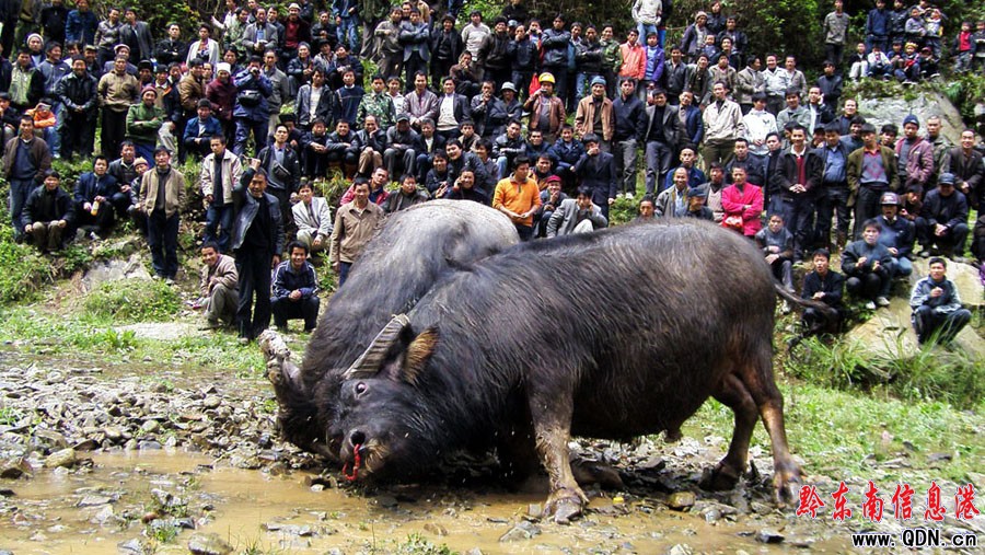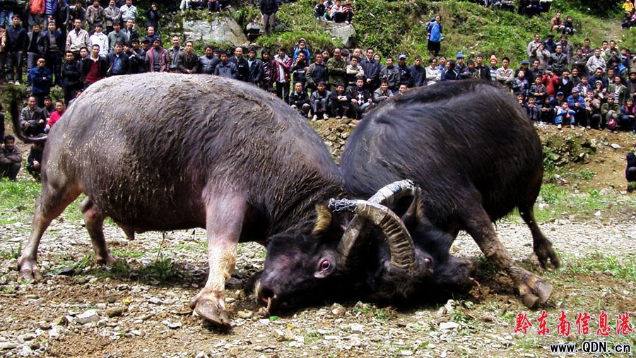 4月15日,在農歷三月三到來之際,黔東南州黎平縣平寨鄉六合花衣苗族人民舉辦“完鼓斗牛慶三月三”活動。據悉,該活動是為了慶祝從去年農歷11月至今年三月三,歷時近5個月的花衣苗族鼓藏節完美落幕。活動當日,吸引了周邊四鄉八寨近3000苗侗同胞前來觀戰,斗牛場面扣人心弦。圖為激烈的斗牛現場(楊代富 楊文斌 攝)