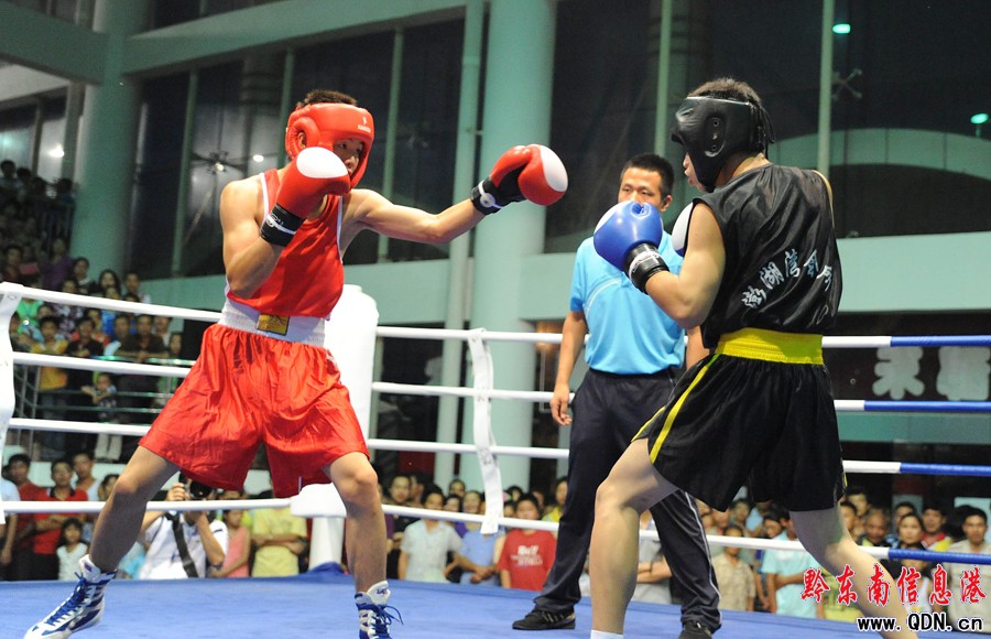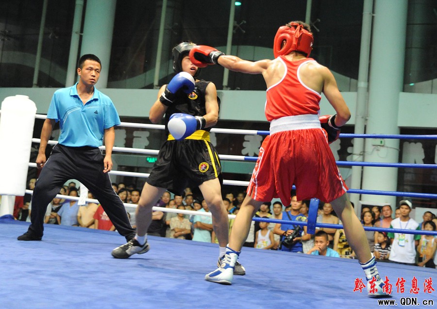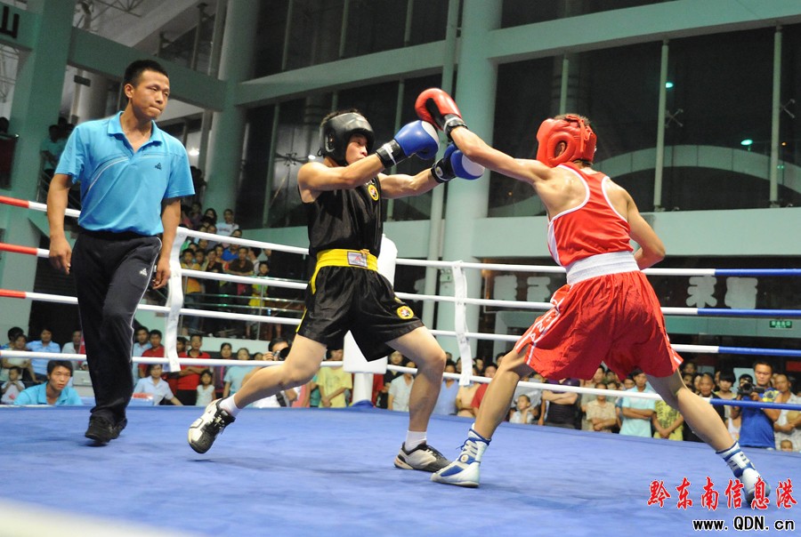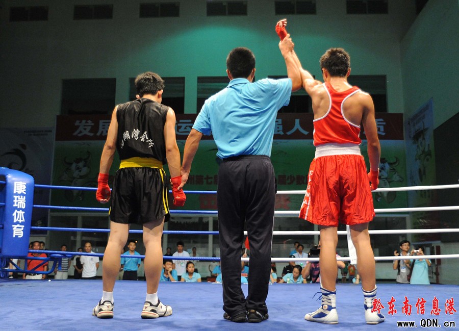 本港訊 (特約記者 黃曉海 攝影報(bào)道)7月25日,在凱里市城南客車站進(jìn)行的七運(yùn)會拳擊決賽中,丹寨選手張輝凱在54公斤級的比賽中擊敗黎平縣選手,為丹寨代表團(tuán)奪得首枚金牌。