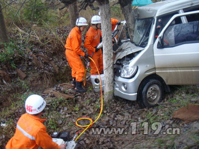 14時(shí)50分,消防官兵到達(dá)現(xiàn)場(chǎng),經(jīng)偵察發(fā)現(xiàn),一輛面包車車速太快剎車不及時(shí),加之下雨路滑,撞在路旁的一棵大樹(shù)上,面包車駕駛室已經(jīng)撞擊變形,坐在副駕駛室的女乘客雙腳擠壓在副駕駛室里,頭部和腿部因劇烈撞擊,被困人員不斷發(fā)出痛苦的呻呤。消防指揮員要求參戰(zhàn)官兵在最短時(shí)間內(nèi)救出被困人員。消防官兵根據(jù)現(xiàn)場(chǎng)情況利用液壓掌頂器將撞變形的部位向外擴(kuò)張,騰出空隙,以便拉出被困人員被卡住的雙腿。在救助過(guò)程中,消防官兵發(fā)現(xiàn)車頭部材料是軟金屬材料,在擴(kuò)張過(guò)程中很容易造成斷裂從而加深傷者的痛苦。消防官兵又利用機(jī)動(dòng)鏈鋸將大樹(shù)鋸斷,使其與嚴(yán)重變形的車頭分離。15時(shí)12分,被困人員被成功救出,隨即被送往醫(yī)院進(jìn)行緊急治救。