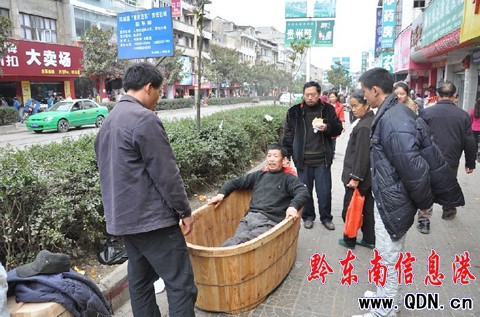 本港訊 (楊仁海 王曉)1月25日是天柱縣城趕場天,一位制作并出售木制盆桶器具的老人在大街上銷售自己打制的浴缸時,鉆入缸內,并安然睡下,一副很舒服自得的樣子,然后大聲叫賣,引起了不少人的關注,沒幾下功夫,這只浴缸便被人以600多元的價格買走。