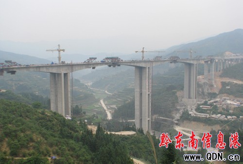 據項目總工程師劉萬林介紹,廈蓉AT5標段位于黎平縣肇興侗寨。線路全長4.85KM。工程包括肇興分離式特長隧道4752米,肇興大橋全長845米和一座小橋。薄壁空心高墩及150米大跨連續剛構施工是本橋的重難點。目前,AT5標段已完成工程建設投資3.8億元,占工程總投資的84%。圖為剛合攏的肇興大橋。