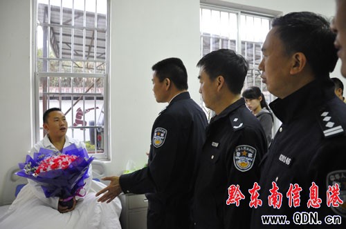 溫貴欽、祝鋼潮、魏肇成看望受傷的武警戰士薛蛟