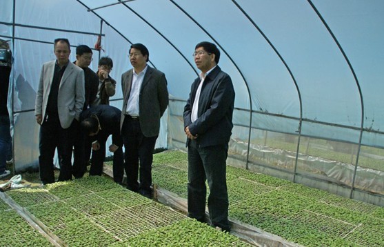 州委常委、常務副州長馮仕文(右一)在示范基地察看烤煙大棚漂浮育苗情況