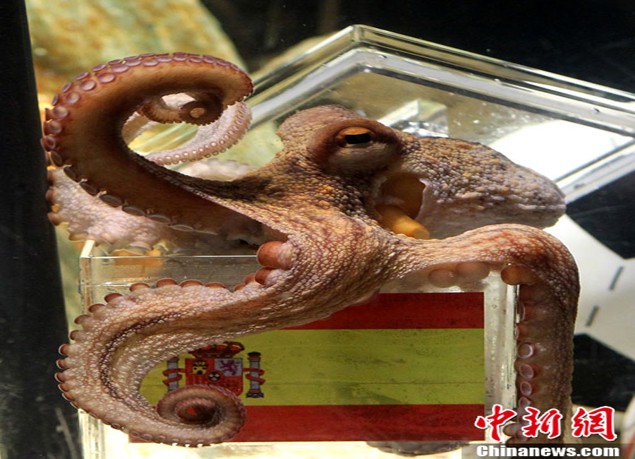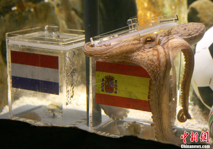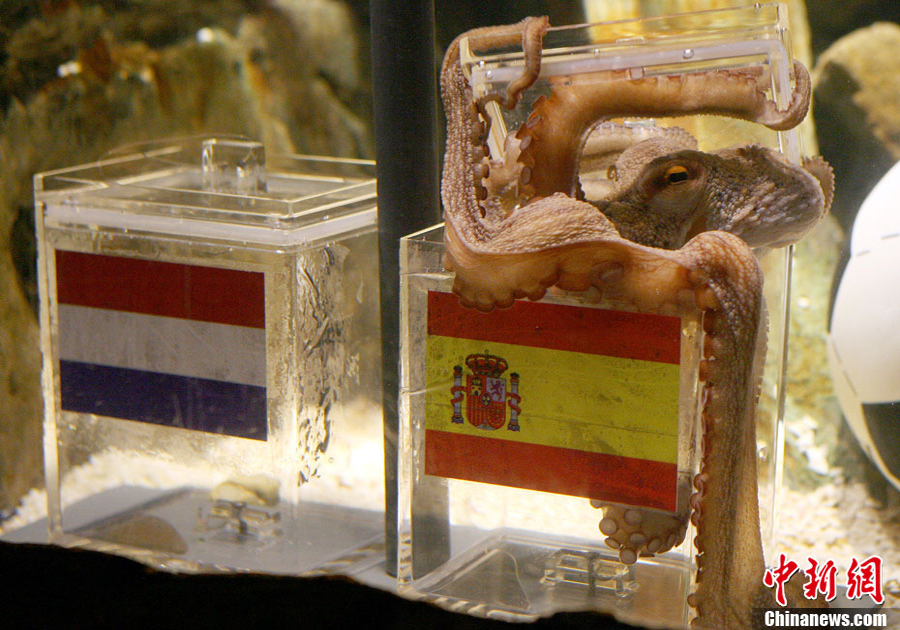 7月9日,神奇章魚保羅對周日凌晨即將進(jìn)行的世界杯決賽順利進(jìn)行了預(yù)測,預(yù)測結(jié)果是西班牙將會(huì)戰(zhàn)勝荷蘭,勇奪世界杯。擁有驕人預(yù)測成績的保羅在做決定的時(shí)候也毫不含糊,在面對印有西班牙國旗和荷蘭國旗的兩個(gè)水槽中,它不假思索直接選擇了歐洲冠軍西班牙,而德國隊(duì)將奪得南非世界杯季軍。