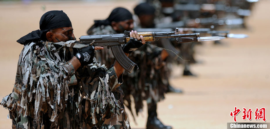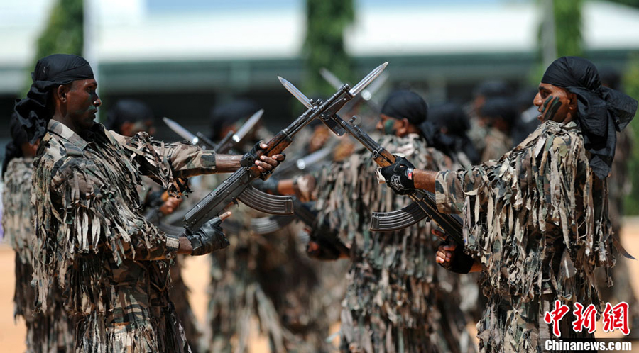 9月17日,在斯里蘭卡東北部城市亭可馬里舉行的空軍閱兵儀式上,116名空軍特種兵展示他們的各項技能。自2009年泰米爾猛虎組織(全稱,泰米爾·伊拉姆猛虎解放組織)的首領普拉巴卡蘭被擊斃,其基地被政府軍攻陷后,斯里蘭卡結束了長達25年的內戰,軍隊實力不斷增加。