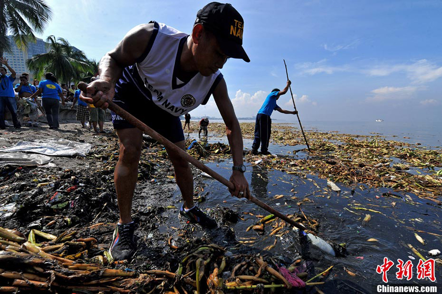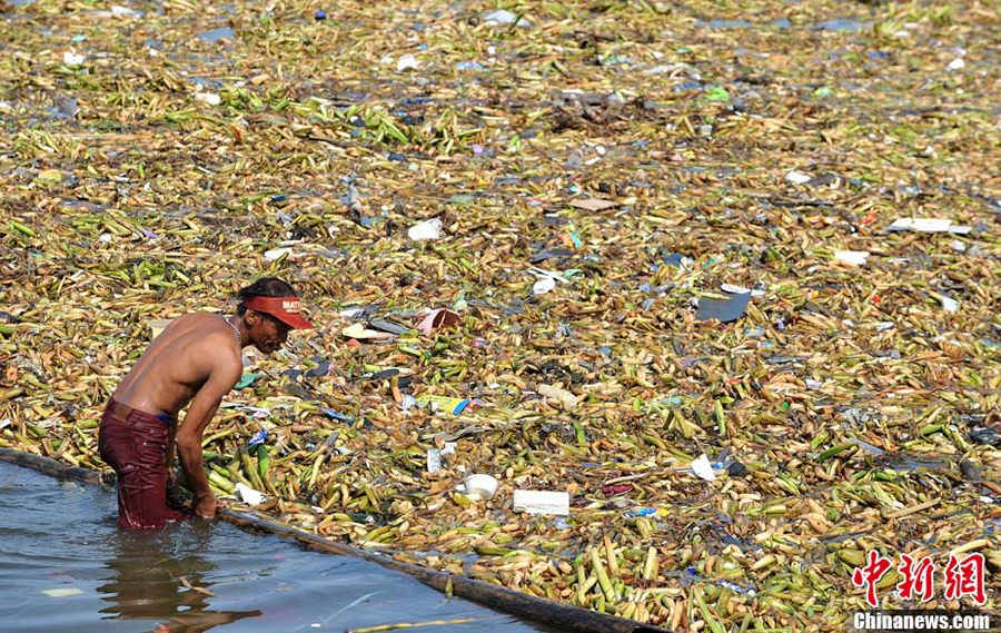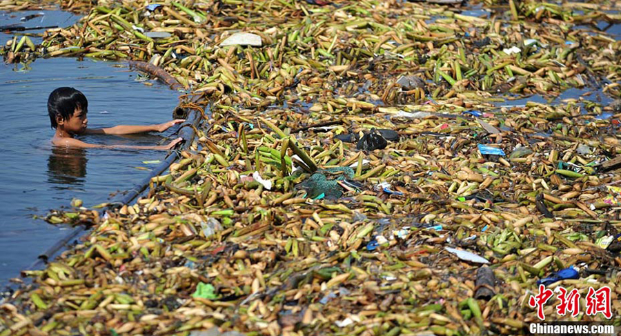 9月19日,菲律賓馬尼拉灣舉行了由眾多志愿者參加的義務清潔河面活動。由于水草瘋狂生長、人們亂扔垃圾,菲律賓馬尼拉灣河面上已經漂滿了各種雜物。有些河段垃圾幾乎覆蓋了全部水面。