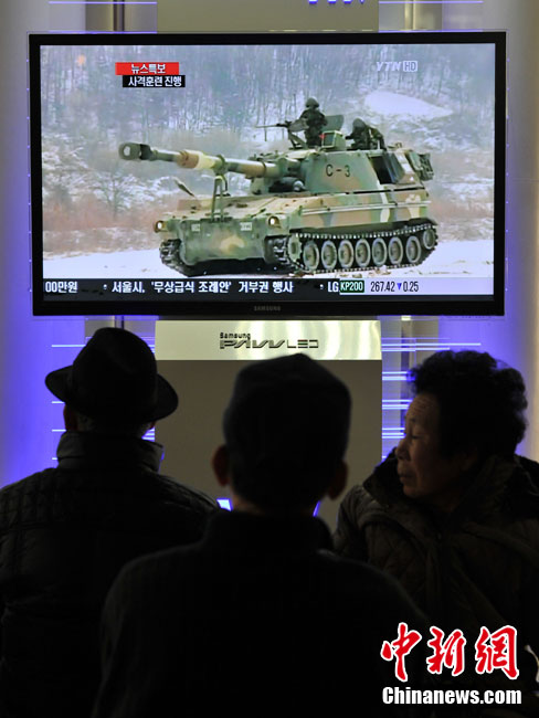 12月20日,韓國(guó)軍方開(kāi)始在延坪島舉行海上實(shí)彈射擊訓(xùn)練。圖為韓國(guó)民眾在電視上收看演習(xí)訓(xùn)練的新聞。
