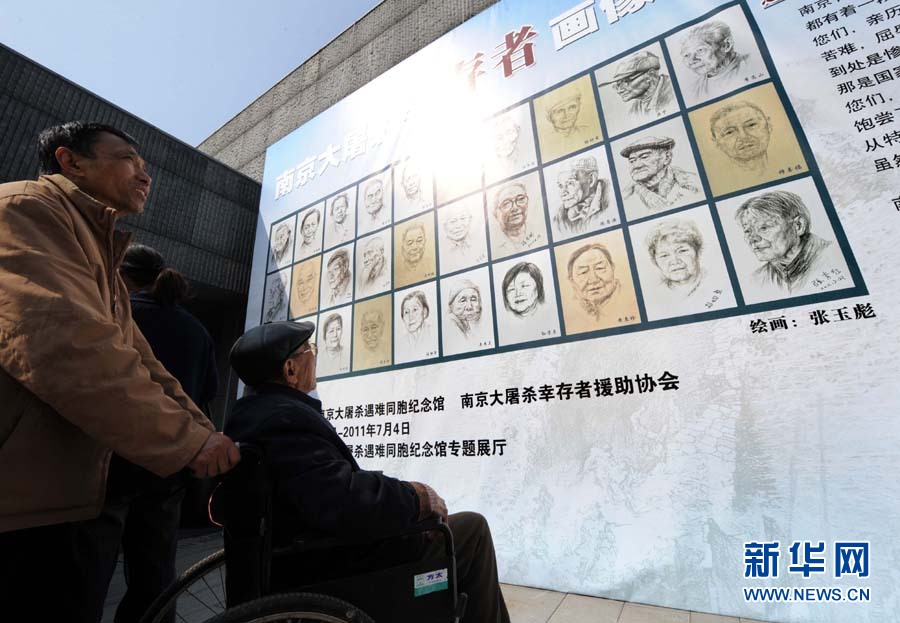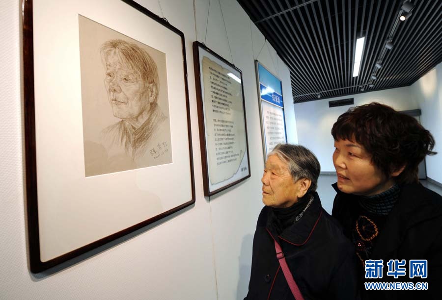 4月5日,參觀者觀看南京大屠殺幸存者素描畫像。當日,由南京藝術學院副教授張玉彪創作的30位南京大屠殺幸存者素描畫像展覽在侵華日軍南京大屠殺遇難同胞紀念館開展。中國作家協會會員、侵華日軍南京大屠殺遇難同胞紀念館館長朱成山為畫像展創作的散文詩一同在展覽上展出。