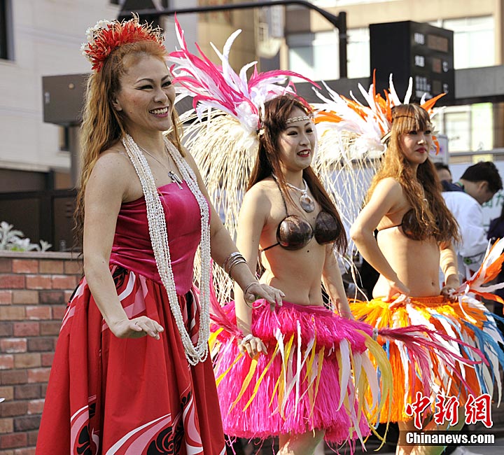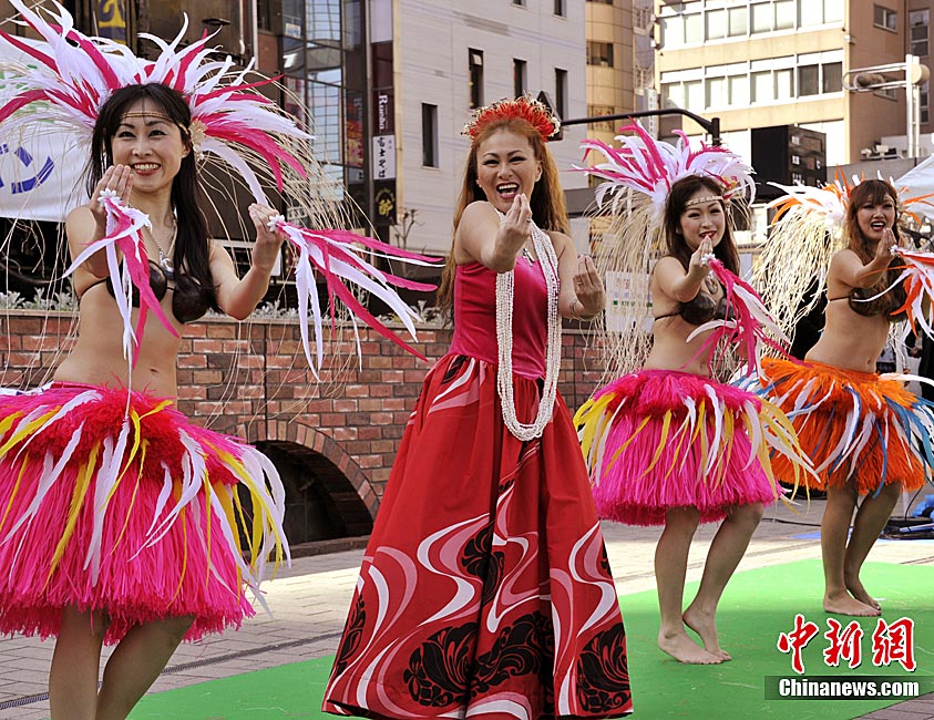 近日,日本東京,草裙舞女郎在購買磐城市蔬菜的顧客前大跳熱舞,鼓勵人們購買福島縣的農產品,防止煤礦小城磐城在核危機打擊下變成一座“鬼城”。