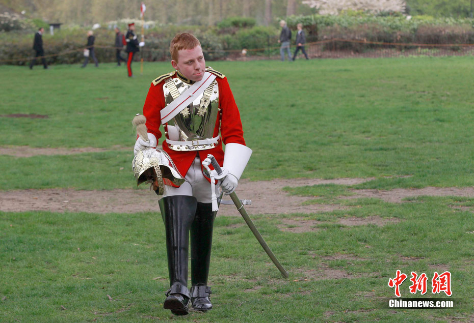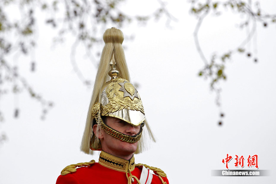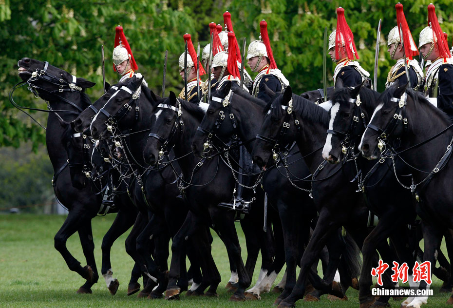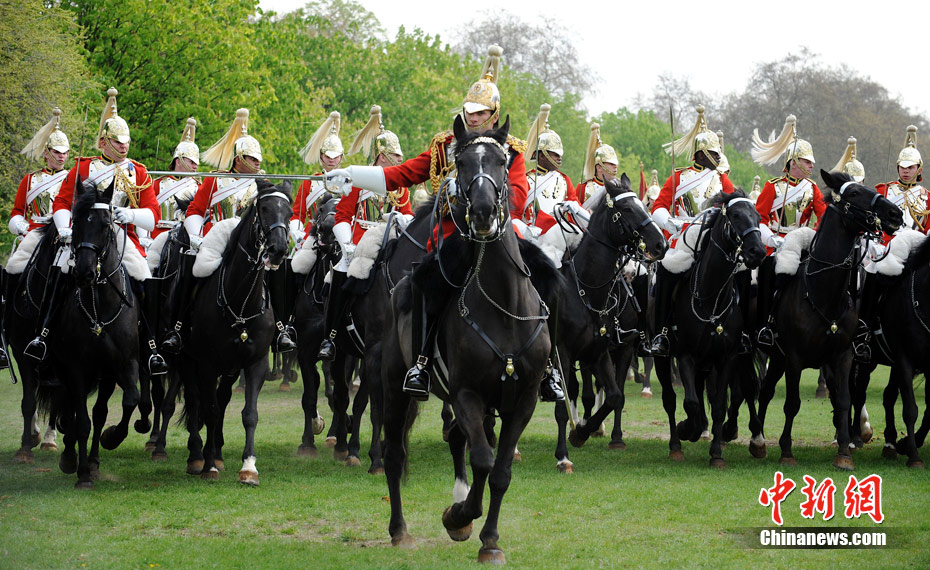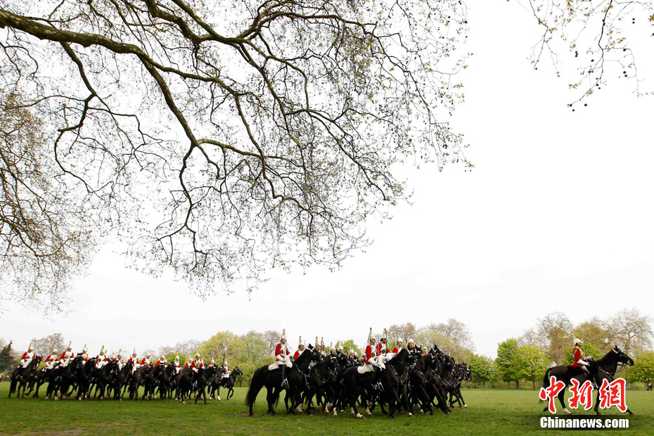 2011年4月14日,英國倫敦海德公園,英國皇家騎兵隊在為一周后的閱兵舉行演習。皇家騎兵隊將在4月21日接受少將的檢閱,以求達到重大儀式的儀仗標準,并為4月29日即將到來的王室婚禮做最后的準備。