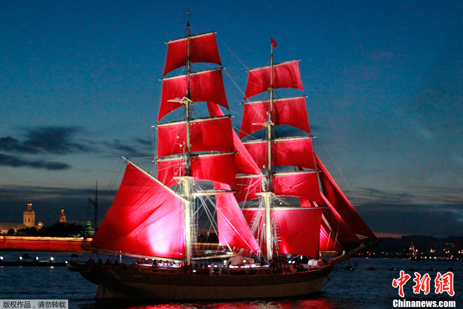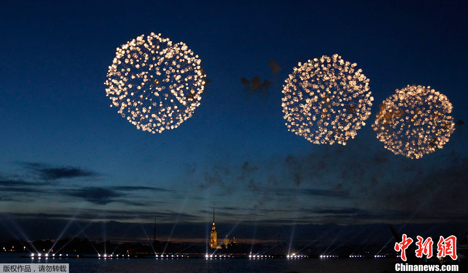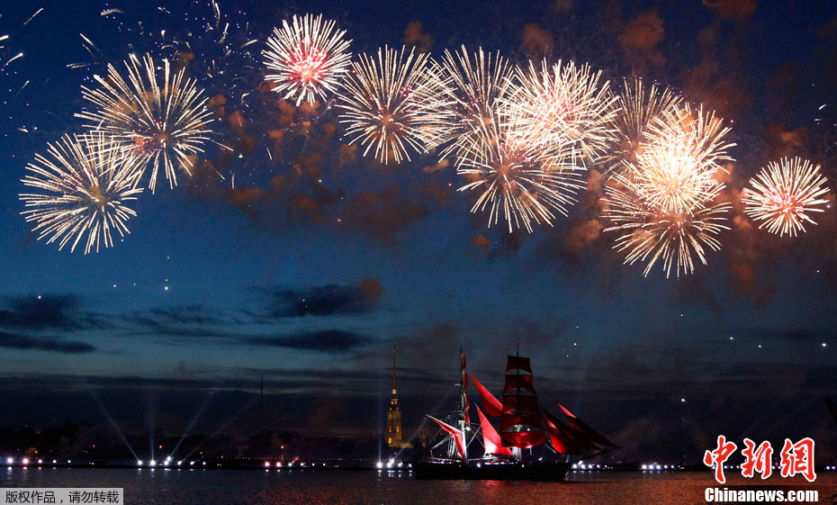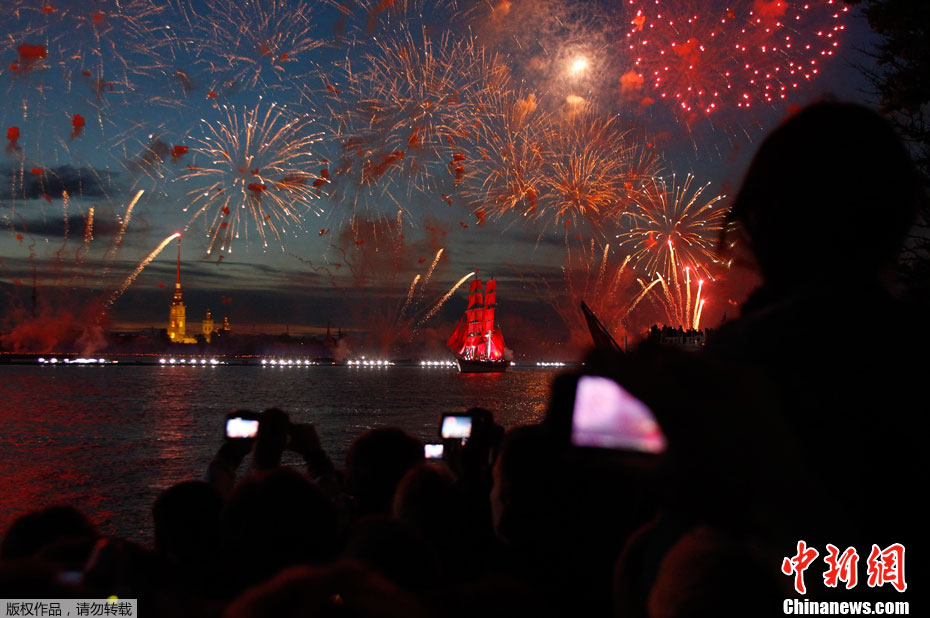2011年6月19日,俄羅斯圣彼得堡涅瓦河畔,人們參加“紅帆節”,觀看煙花表演。“紅帆節”是一年一度的慶祝中學畢業生的節日。每年夏至白晝前最后一個周五的夜晚,圣彼得堡都會舉辦“紅帆節”,它是為了讓所有的中學畢業生告別少年,在黎明來臨之際迎接人生新的階段。