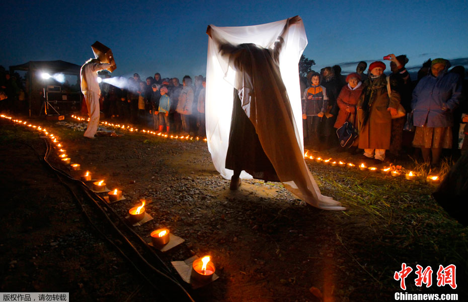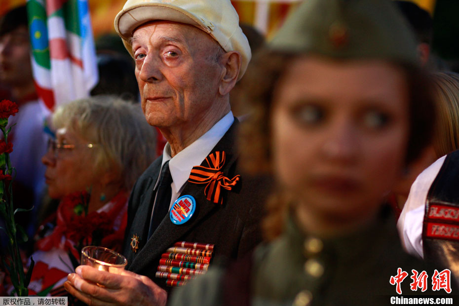 2011年6月22日,俄羅斯首都莫斯科,在克里姆林宮外的無名烈士墓前,市民和二戰老兵手持蠟燭和鮮花紀念“衛國戰爭”爆發70周年。1941年6月22日,德國法西斯突然閃擊前蘇聯,前蘇聯人民開始了艱苦卓絕的衛國戰爭,直到1945年5月2日柏林戰役結束。