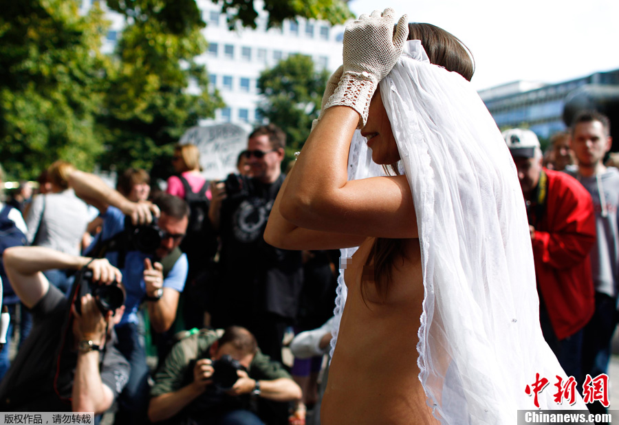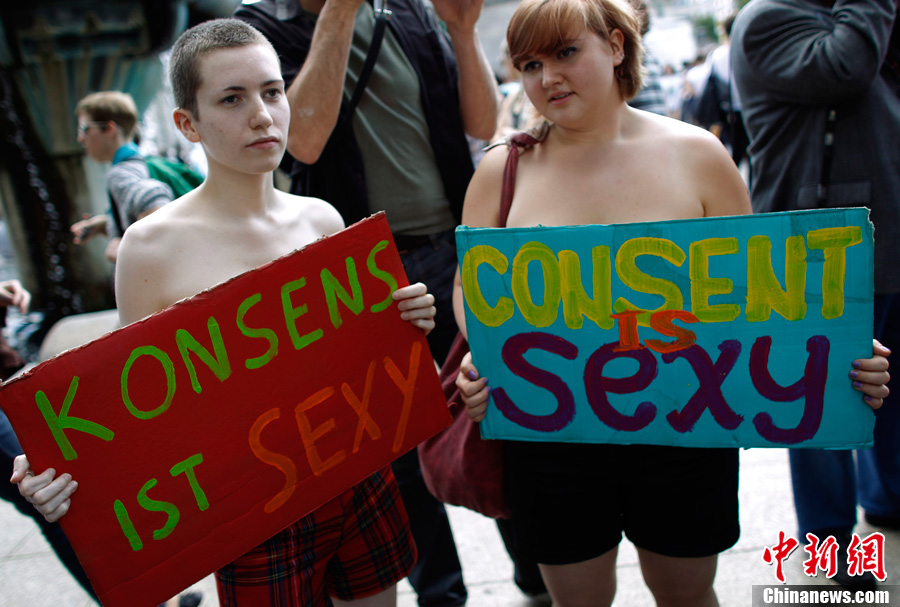 8月13日,德國柏林,穿著暴漏的女子參加“蕩婦游行”抗議對女性性虐待。該活動已在全球數(shù)個城市展開。