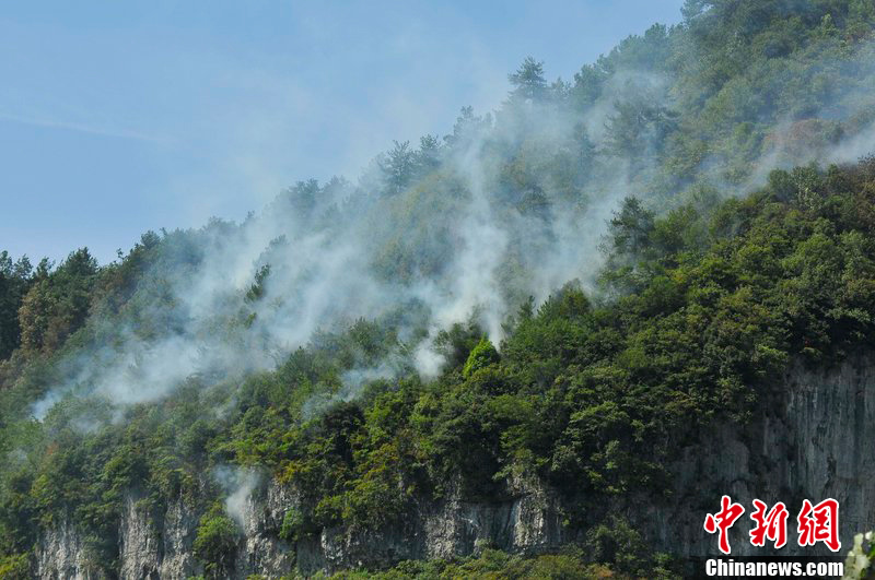 2011年8月15日,貴州省黔東南州凱里市龍場鎮江口大峽谷和龍場煤礦相距3公里的兩處山崖石縫中突然竄出無數的火焰和煙霧,這些火焰在不斷竄起中繼而引起附近多處發生山林大火。陳沛亮 攝 圖片來源:CFP視覺中國