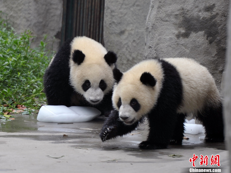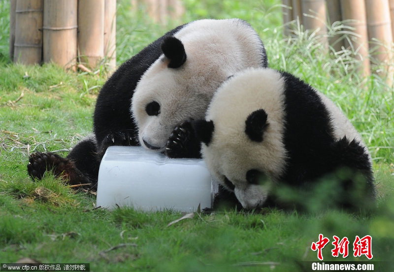 8月17日,成都的高溫天氣仍在持續(xù),繁育研究基地內(nèi)的大熊貓與冰為伴。大熊貓除在室內(nèi)享受空調(diào)生活外,工作人員還在室外園區(qū)放置了大量的冰塊,讓大熊貓在玩耍之余也能降溫避暑。圖為大熊貓與冰共“舞”。中新社發(fā) 劉忠俊 攝
