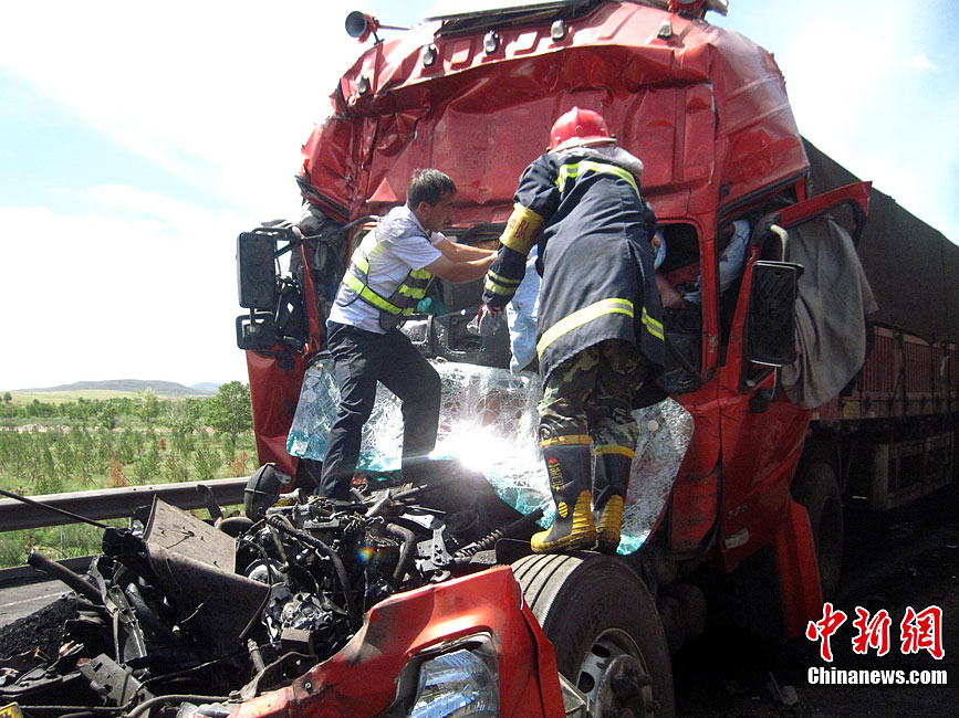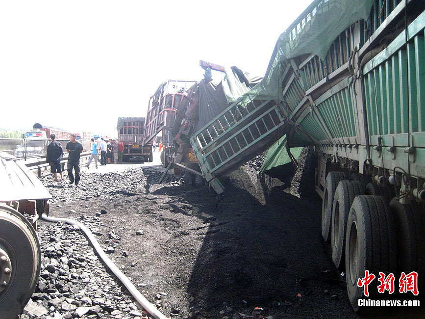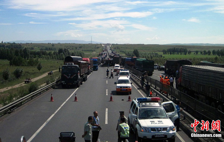 京藏高速內(nèi)蒙古集寧段8月18日早晨發(fā)生30多輛貨車連環(huán)相撞事故,目前已造成6死5傷。圖為事發(fā)現(xiàn)場。中新社發(fā) 張龍里 攝