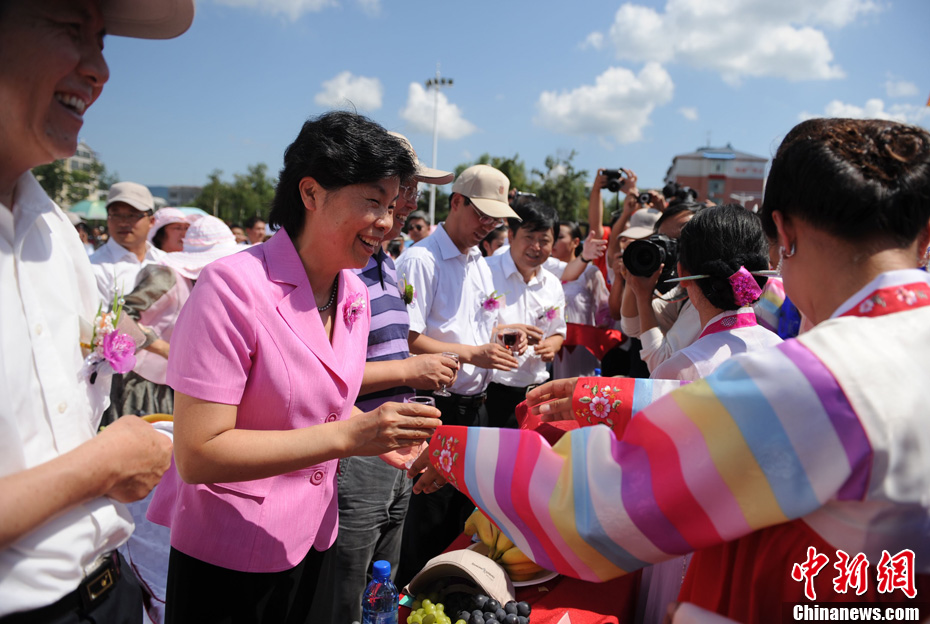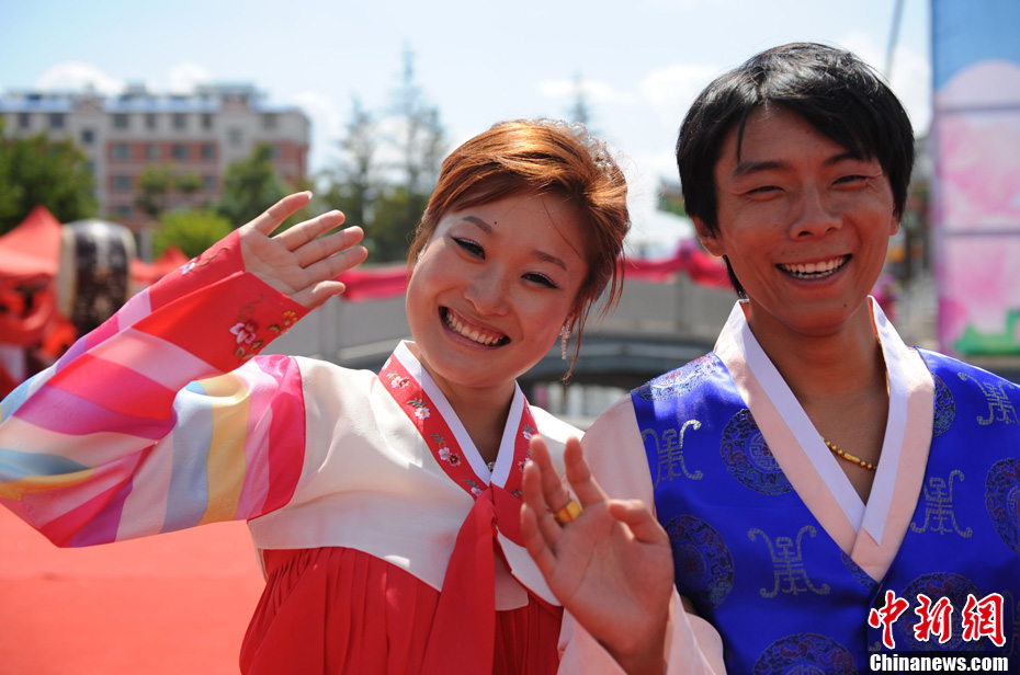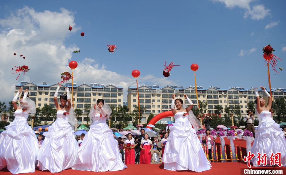 8月25日,由國家人口計生委和中國人口宣傳教育中心舉辦的“2011·中國幸福家庭萬里行”暨“吉林延邊長白山年人口文化節”在延吉開幕。為慶祝這一活動,和龍市舉辦首屆以“長白山下金達萊,花開為媒連真愛”為主題的大齡青年集體婚禮,19對朝鮮族和漢族新人采用漢、朝兩種婚俗形式喜結良緣。中新社發 曾利明 攝