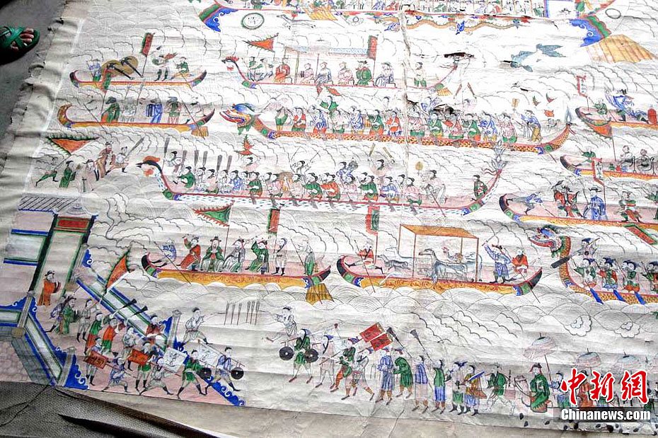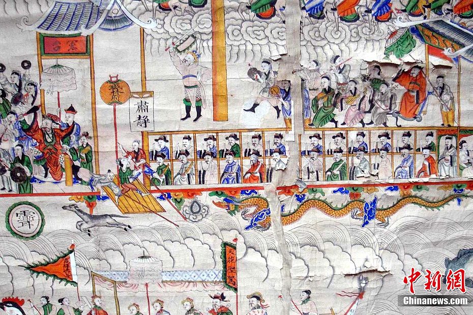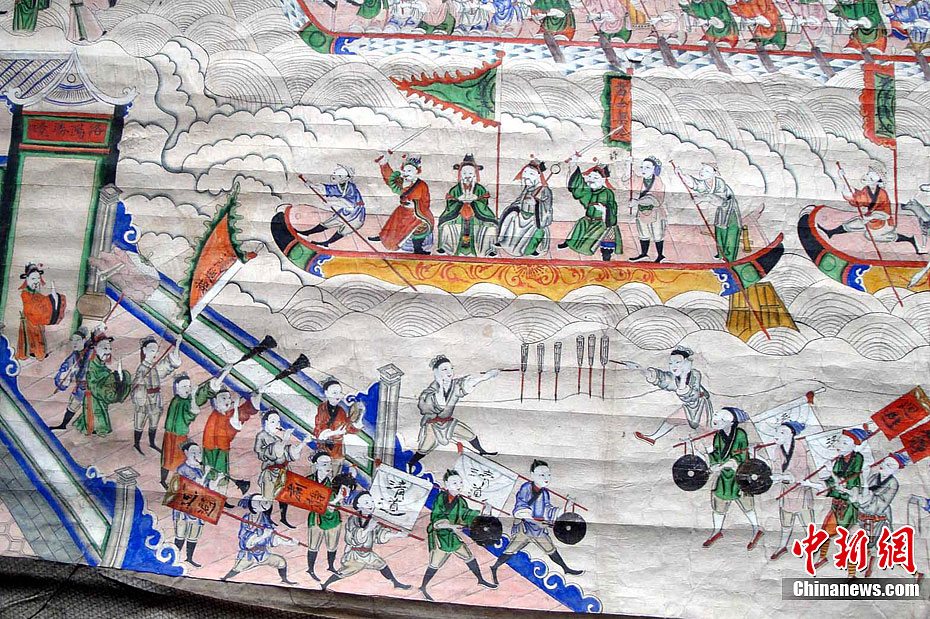 日前,江西省遂川縣雩田鎮衡溪“古南鄉蔣氏宗祠”在進行拆舊維修時,工作人員在宗祠中廳的屋檐下,發現一幅彩色巨型古畫。該畫長2.2米,寬1.98米,畫工筆法細膩,線條明快流暢,色澤瑰麗鮮艷,人物栩栩如生。畫上繪有人物292個,衣著紋飾精美,面部神態逼真,表情豐富多彩,神態動作各異。目前,衡溪蔣氏家族已將古畫移交該縣博物館保存。由于沒有題跋印章,該畫的具體繪制年代還有待于進一步考證。李建平 攝