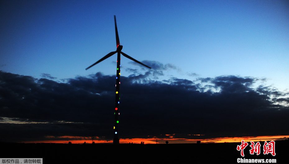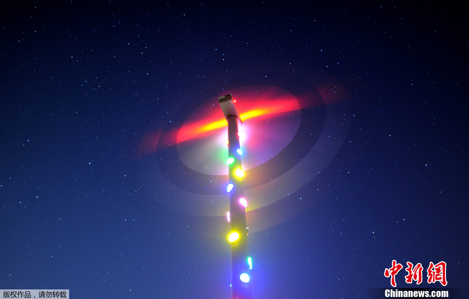9月5日,在德國(guó)北部城市漢諾威,一名男子站在一座裝配了彩燈的風(fēng)力發(fā)電機(jī)前。這套燈光裝置由法國(guó)藝術(shù)家帕特里克·雷諾設(shè)計(jì),在2000年漢諾威世博會(huì)時(shí)亮相。根據(jù)設(shè)計(jì)原理,彩燈的能源由風(fēng)力發(fā)電機(jī)提供,并且風(fēng)力越大,燈光越亮。