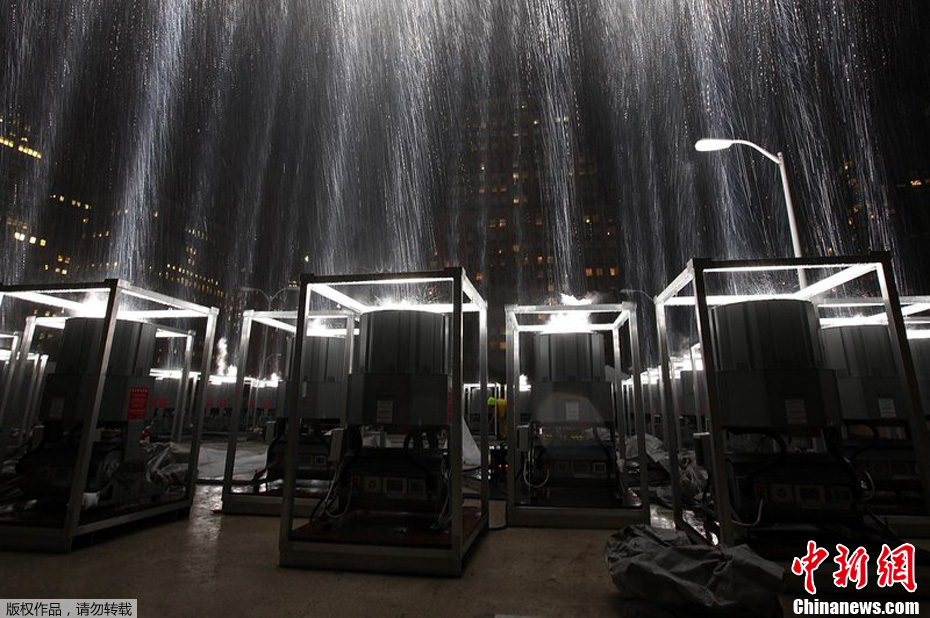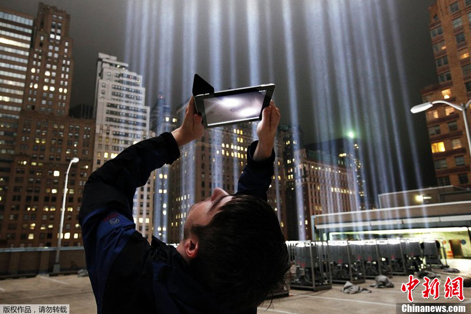 9月7日,美國紐約,紀念光柱測試時下起了雨。11日是“9·11”恐怖襲擊事件十周年紀念日,在紐約世貿中心原址上建立的9/11紀念碑和紀念館將首次對外開放。紀念碑上會鐫刻在2001年9月11日恐怖襲擊中喪生的近2753位遇難者及1993年世貿中心汽車炸彈爆炸中遇難的6人的名字。圖片來源:CFP/視覺中國