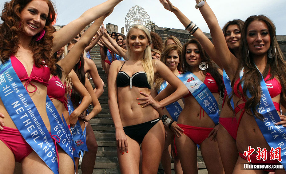 9月18日,來自美國、加拿大、巴西、法國以及中國內地、中國臺灣等73個國家和地區的比基尼佳麗匯聚北京,參加第36屆國際比基尼小姐大賽全球總決賽外景地的拍攝。圖為佳麗在長城身穿浩沙比基尼大展風采。中新社發 錢興強 攝