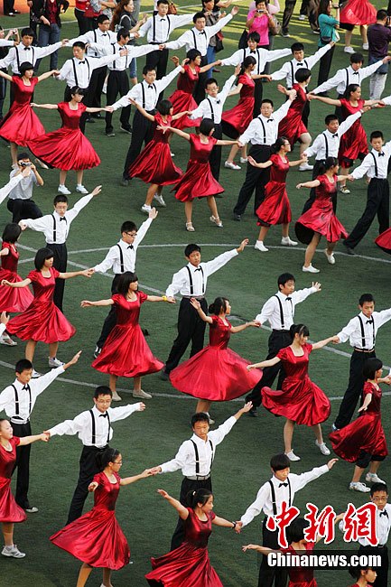 9月23日,中學生們在山東濰坊市奎文實驗初中操場上翩翩起舞。當日,一場“校園華爾茲”活動在該校舉行,700多名中學生在操場上牽手、進退步、旋轉。“校園華爾茲”讓他們興奮不已。舒展大方的動作,變幻多姿的舞步,優美動聽的音樂,成為校園一道亮麗的風景線。中新社發 張馳 攝 圖片來源:CNSPHOTO