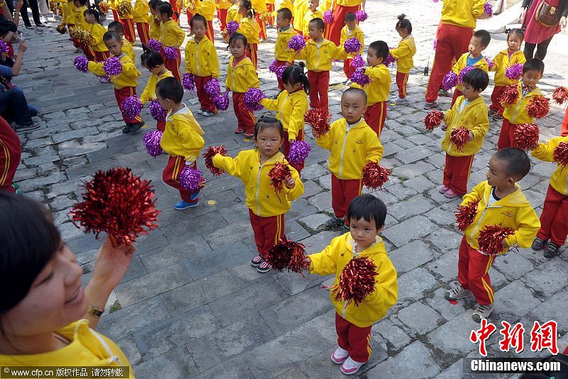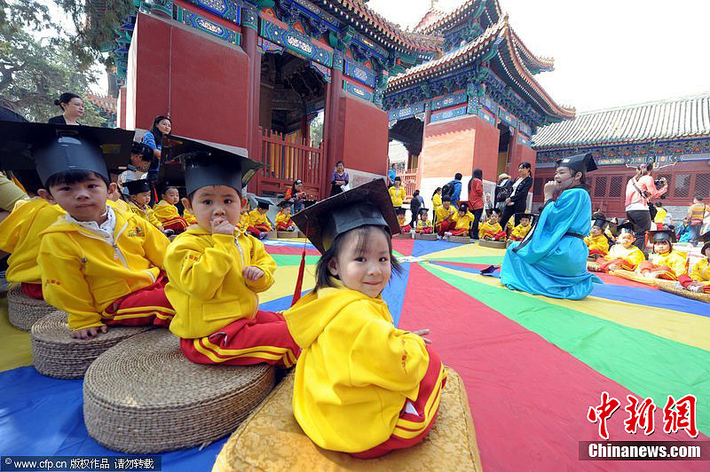 9月23日,北京朝陽東方子楹雙語幼兒園將國學(xué)課堂開進(jìn)了國子監(jiān)孔廟,199名小朋友圍坐在一起上國學(xué)課、做國學(xué)操。孩子們用童聲朗誦著《弟子規(guī)》、《百家姓》、《三字經(jīng)》等國學(xué)力作,大班的幼兒還練起了中國功夫。圖為小朋友圍坐在一起上國學(xué)課、做國學(xué)操。歐陽曉菲 攝 圖片來源:CFP視覺中國