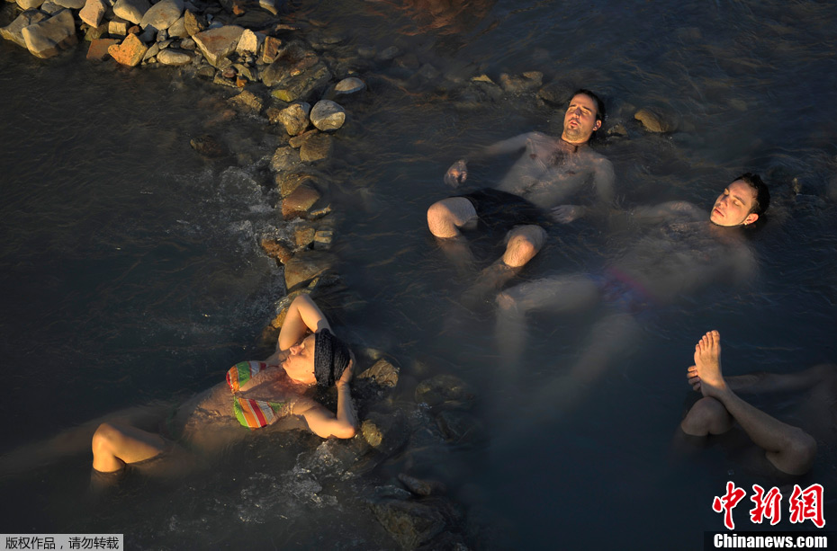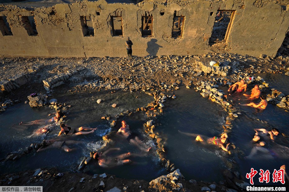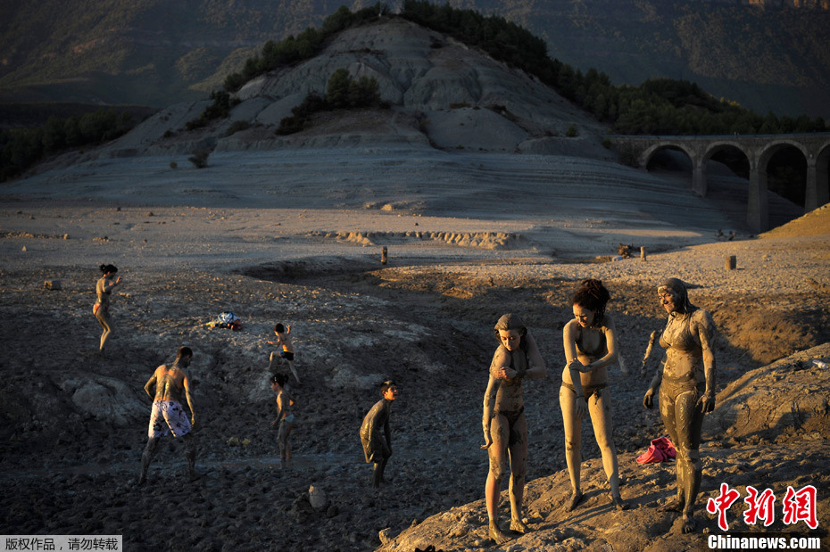 當地時間10月1日,在西班牙北部耶薩(Yesa)村落的泰耶爾馬斯(Tiermas)一處廢棄的古代大浴場里,人們在溫水中用泥巴覆蓋全身享受泥浴。耶薩地區在每年秋季時分水位達到最低點,是適宜泥浴的時節。
