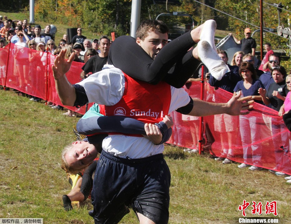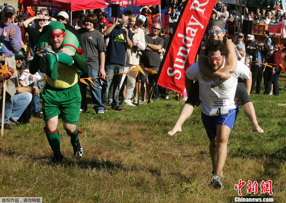 2011年10月8日,在美國緬因州紐里,一年一度的“背老婆”大賽如火如荼地進行著,來著美國、加拿大等國的選手們參加了此次比賽。