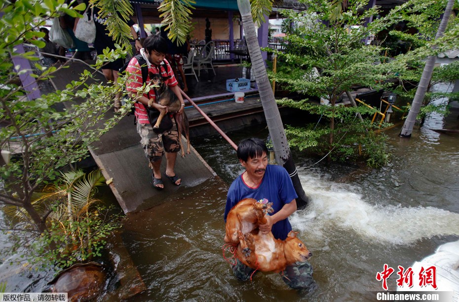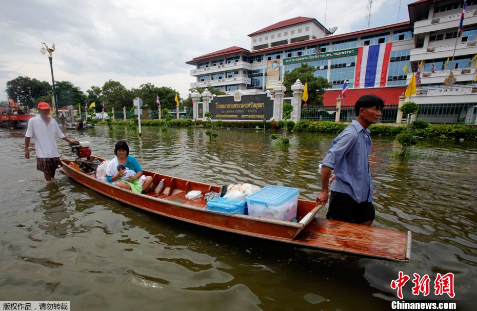 泰國正在遭遇半個世紀以來最嚴重的洪澇災害。泰國內政部公布的最新數據,持續肆虐的洪災已經造成了261人死亡,4人失蹤,全國四分之三的地區受到影響。首都曼谷面臨著數十年來最嚴峻的考驗。圖為10月9日,阿瑜陀耶的一名婦女被轉移到安全地帶。