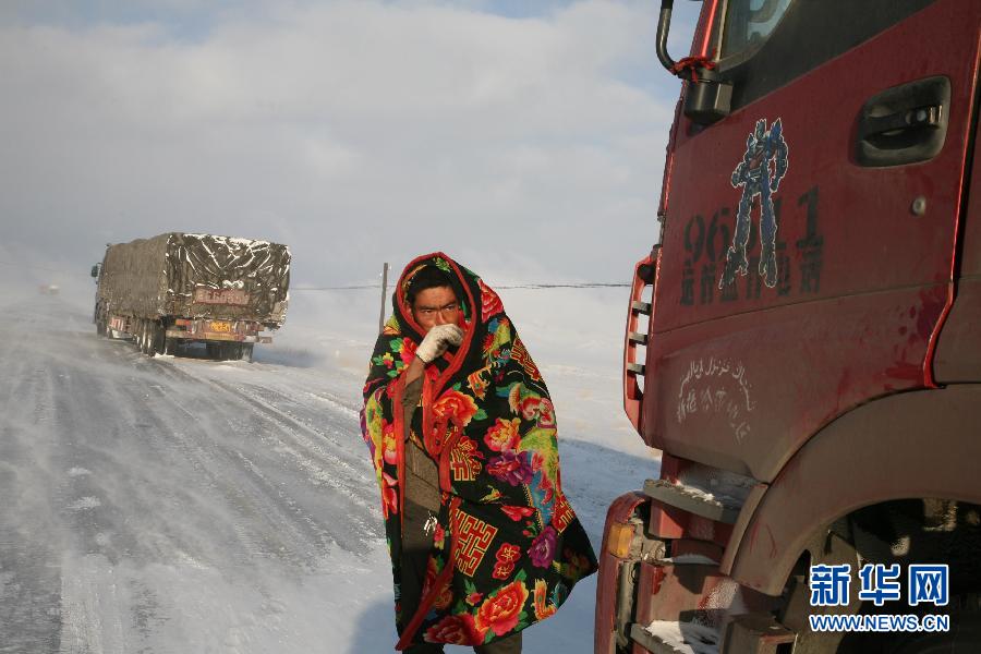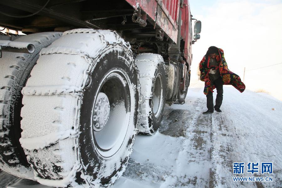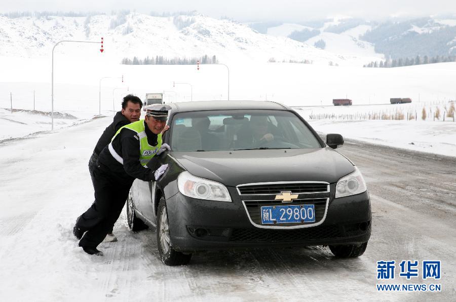 10月12日,交警在新疆303省道哈密段疏導交通。受冷空氣影響,10月11日至12日凌晨,新疆哈密北部沿天山一帶出現風雪降溫天氣,造成302、303省道部分路段積雪結冰,能見度不足百米,302省道全線和303省道天山路段被迫臨時關閉。新華社發(蔡增樂 攝)圖片來源:新華網
