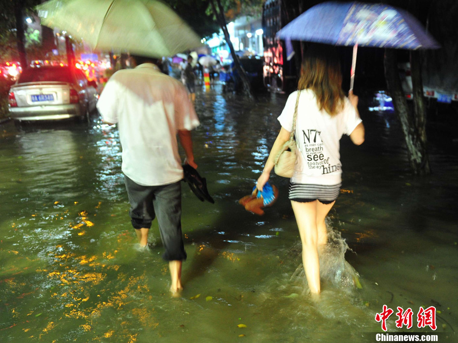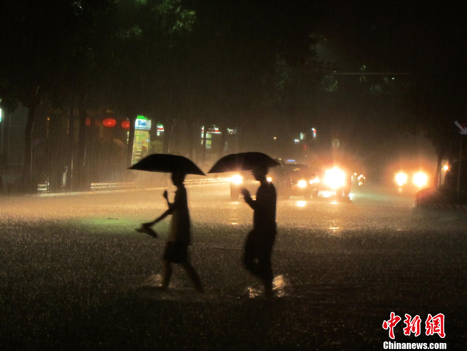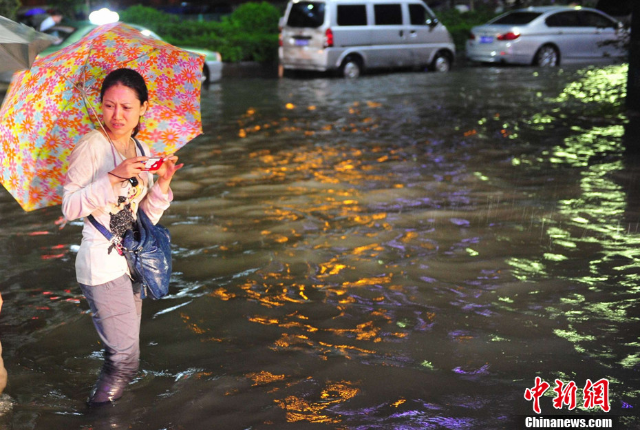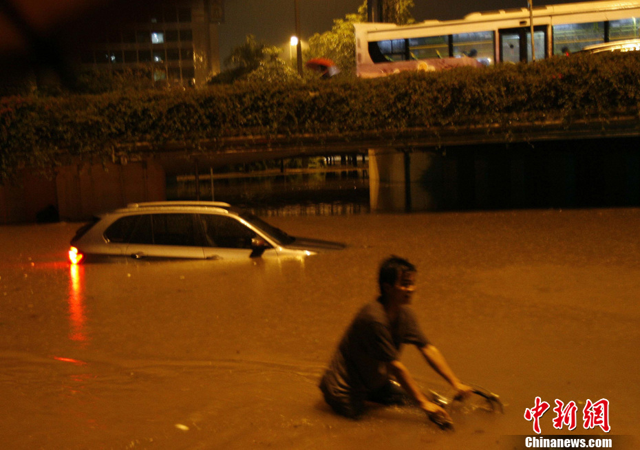 13日晚,一場暴雨襲擊了廣州,市內多處路段積水嚴重影響交通,一部困在水中的公共巴士乘客走光,只剩司機焦急等待救援。中新社發 柯小軍 攝