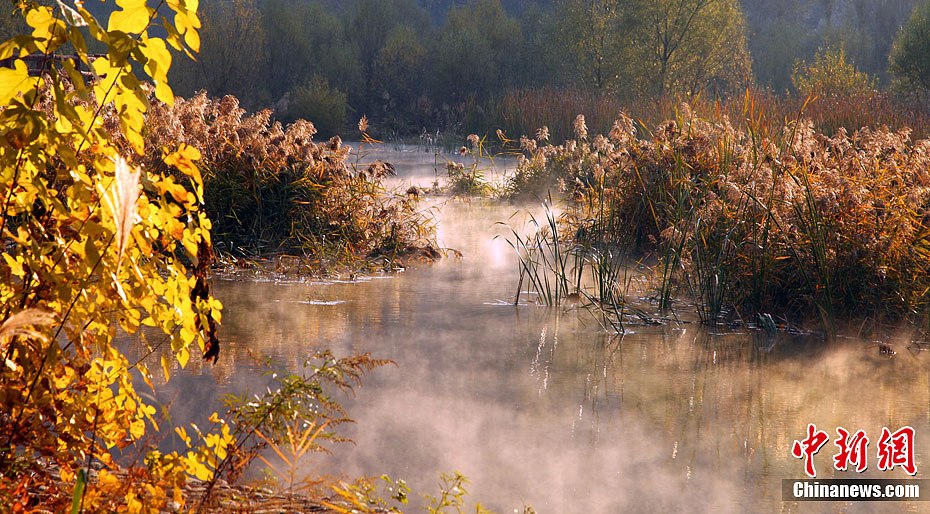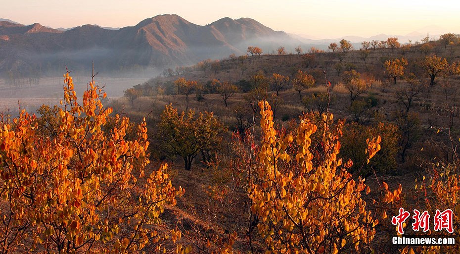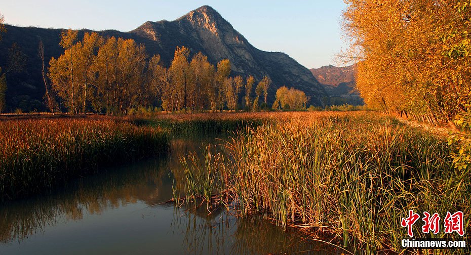 10月18日清晨,北京市懷柔區湯河口鎮后安嶺村河邊的美麗秋景。眼下,京郊懷柔山區鄉村水天相依秋景如畫,處處呈現出一派色彩斑斕的鄉村絢爛景色,令人目不暇接流連忘返。中新社發 卜向東 攝 圖片來源:CNSPHOTO