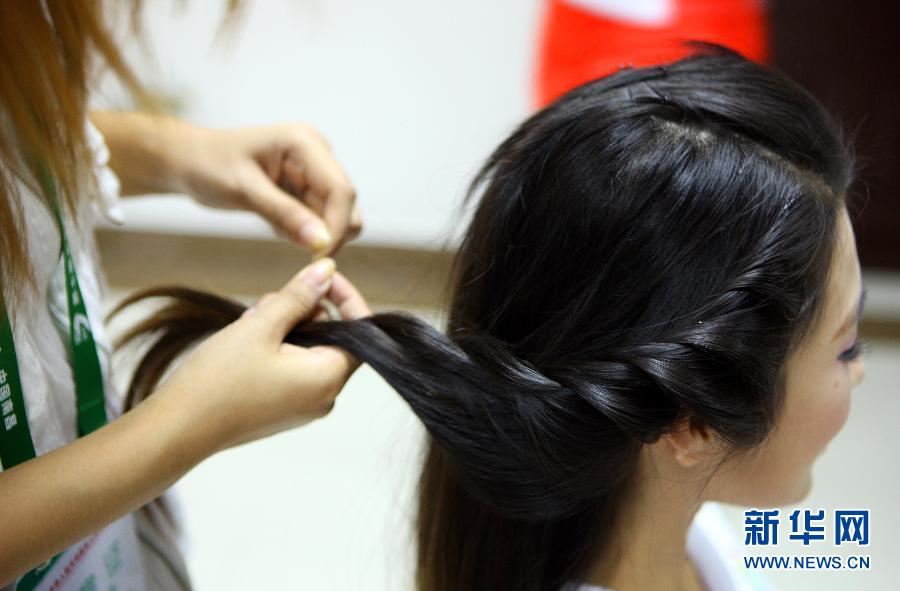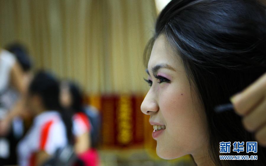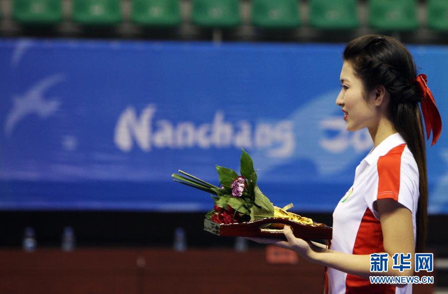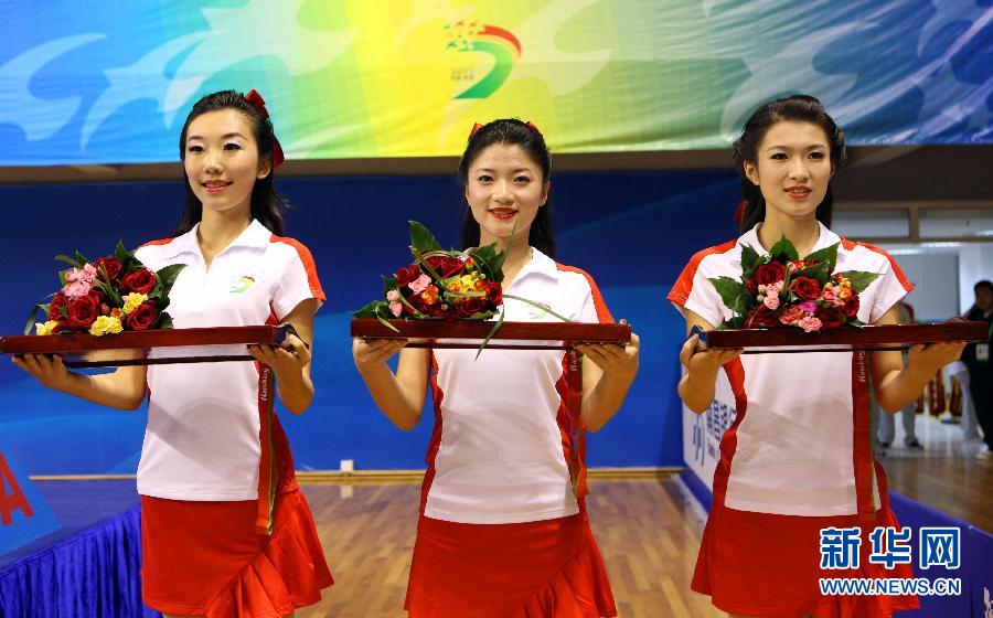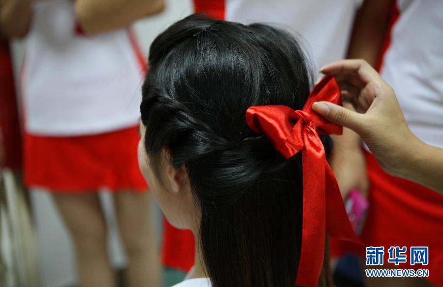 10月18日,來自南昌大學的禮儀小姐在城運會摔跤項目頒獎室展示頭飾。第七屆城市運動會共有150名來自南昌各高校的大學生為賽事頒獎服務。她們4月份開始接受相關禮儀培訓,經過嚴格的訓練成為禮儀小姐。她們頭戴醒目的紅色蝴蝶結忙碌在各個賽場,成為頒獎儀式上一道亮麗的風景。新華社記者李明攝