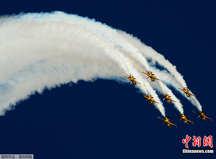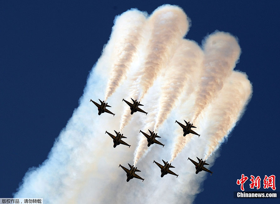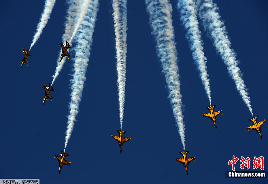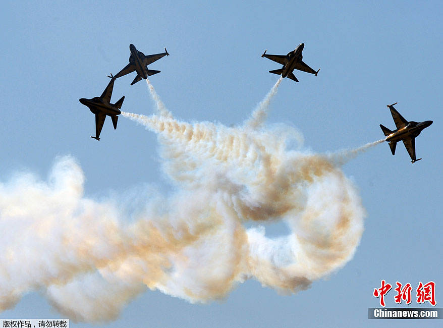 10月18日,在韓國城南市,2011年首爾國際航空防務展在韓國城南市首爾機場開幕。圖為韓國空軍舉行的飛行表演。