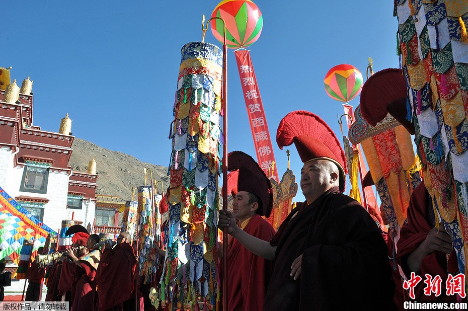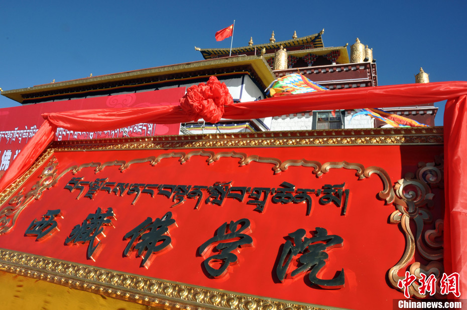 10月20日,西藏佛學院在拉薩正式落成開院。600余名學院教職員工、學員及信教群眾參加學院落成暨開院典禮。據悉,西藏佛學院從西藏各大寺院聘請了13名拉然巴格西作為教師,目前首期學員150人已經入學。西藏佛學院課程首次分設了顯宗、密宗和活佛三個學部,開設了法制、公共和佛學三類課程。圖為西藏自治區黨委常委、自治區常務副主席洛桑江村(右)和中國藏語系高級佛學院院長那倉·向巴昂翁(左)為西藏佛學院揭牌。陳香玉 攝