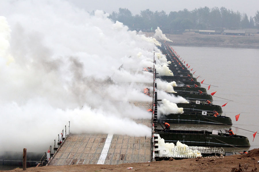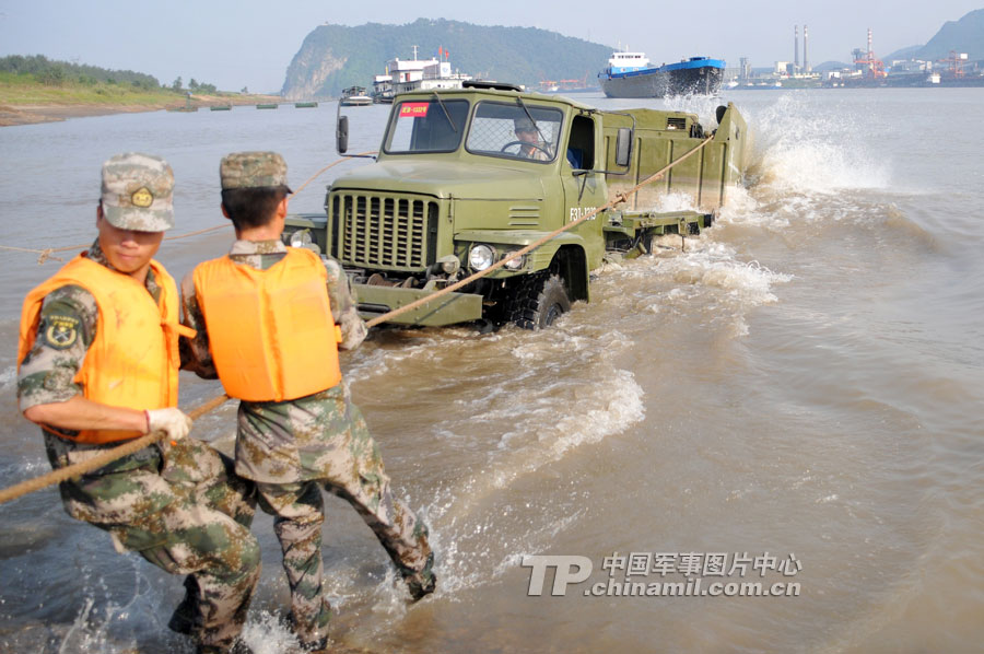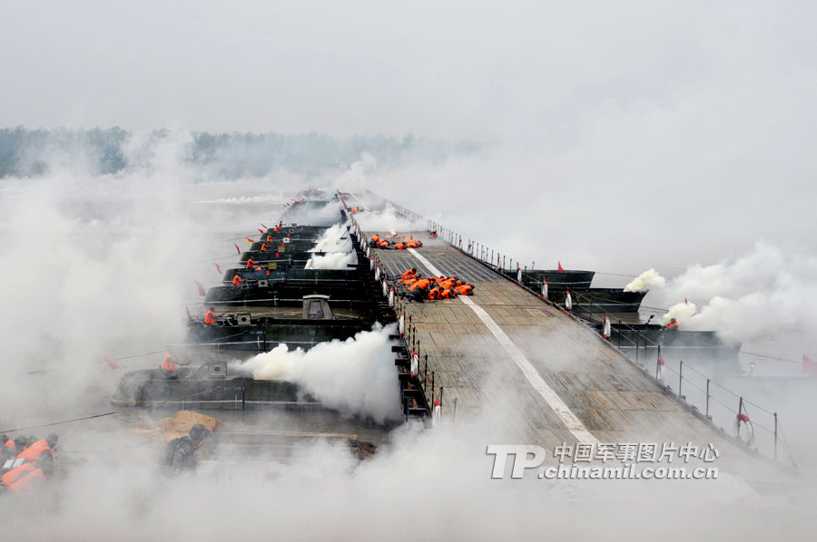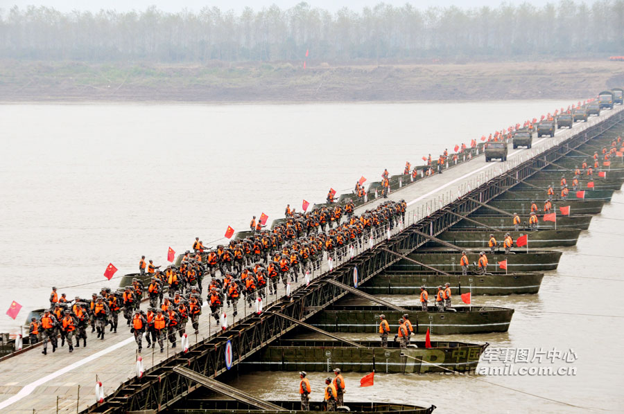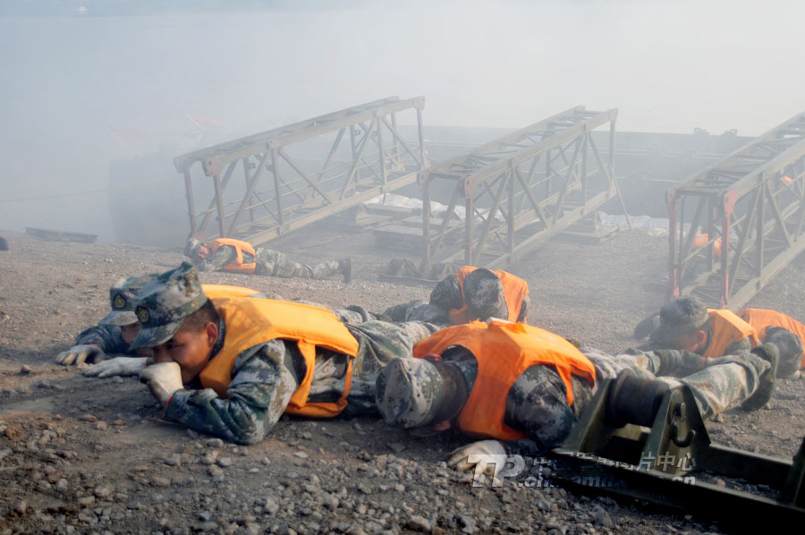 22分鐘,在長江上架起一座600多米的鋼鐵浮橋?你相信嗎?日前,記者走進廣州軍區(qū)某舟橋旅野訓場,舟橋官兵用實際行動證實了此言非虛。當日上午9點,隨著某舟橋旅旅長邱啟建的一聲令下,兩顆紅色信號彈騰空而起,在長江湖北某水域浮橋渡口、門橋渡口、假浮橋渡口同時展開作業(yè)。隱蔽在長江沿岸的假浮橋編隊、新型特舟編隊、門橋編隊,如同離弦的劍,迅速駛向預定浮橋渡場。一時間,江面上成為了官兵拼搏的戰(zhàn)場,構筑我岸和對岸碼頭、門橋連接、火炮渡送,官兵們激戰(zhàn)正酣。