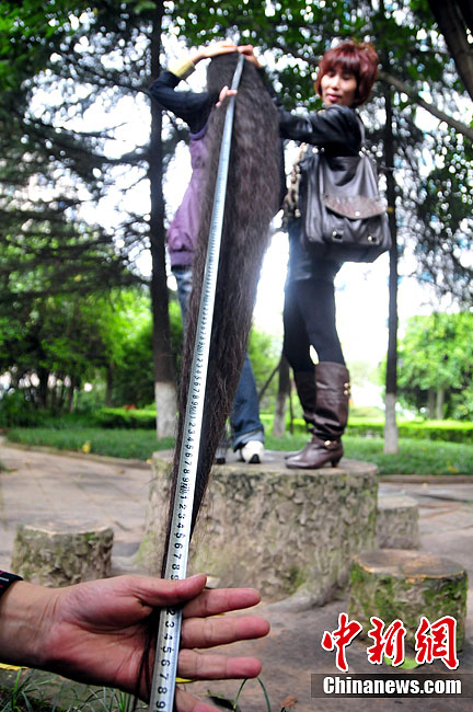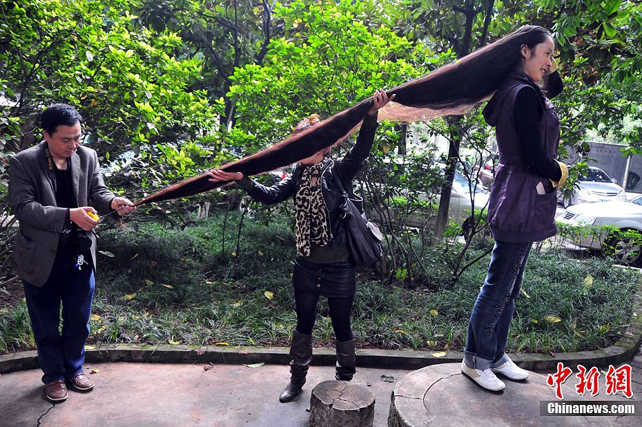 10月27日,家住在四川省南充市蓬安縣周口鎮(zhèn)的居民劉春在展示自己蓄了15年的長(zhǎng)發(fā),她的頭發(fā)長(zhǎng)度遠(yuǎn)遠(yuǎn)超過了自己的身高。據(jù)劉春介紹,自15年前她生下兒子后便蓄了長(zhǎng)發(fā),現(xiàn)在頭發(fā)最長(zhǎng)的部分已有2.3米,長(zhǎng)發(fā)如瀑。如今,每天護(hù)理長(zhǎng)發(fā)已成為劉春生活的重要組成部分。據(jù)了解,劉春的2.3米長(zhǎng)發(fā)高過巨人姚明的身高。中新社發(fā) 李向雨 攝 圖片來(lái)源:CNSPHOTO