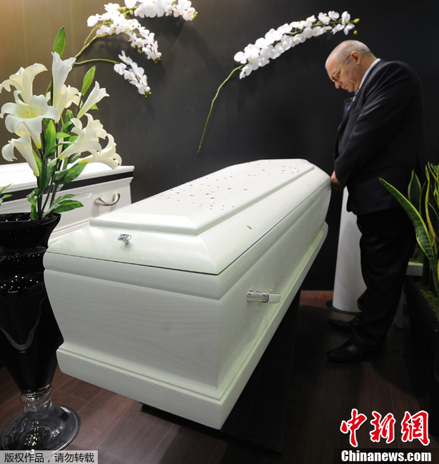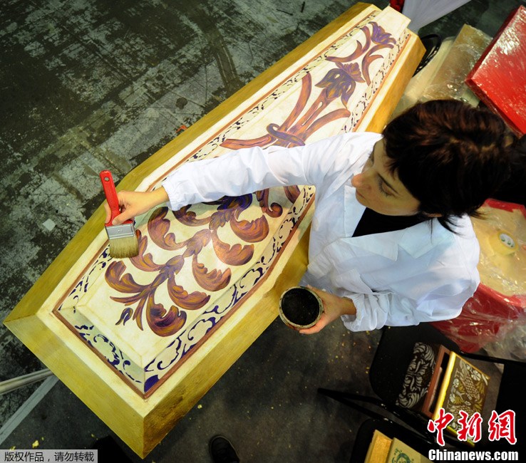 10月27日,莫斯科舉行第10屆墓地展,種類豐富、造型或精致或創意的棺材吸引了眾人的目光。俄羅斯人講究品味,就連墳墓也不例外。圖為一副魚兒造型的棺材。