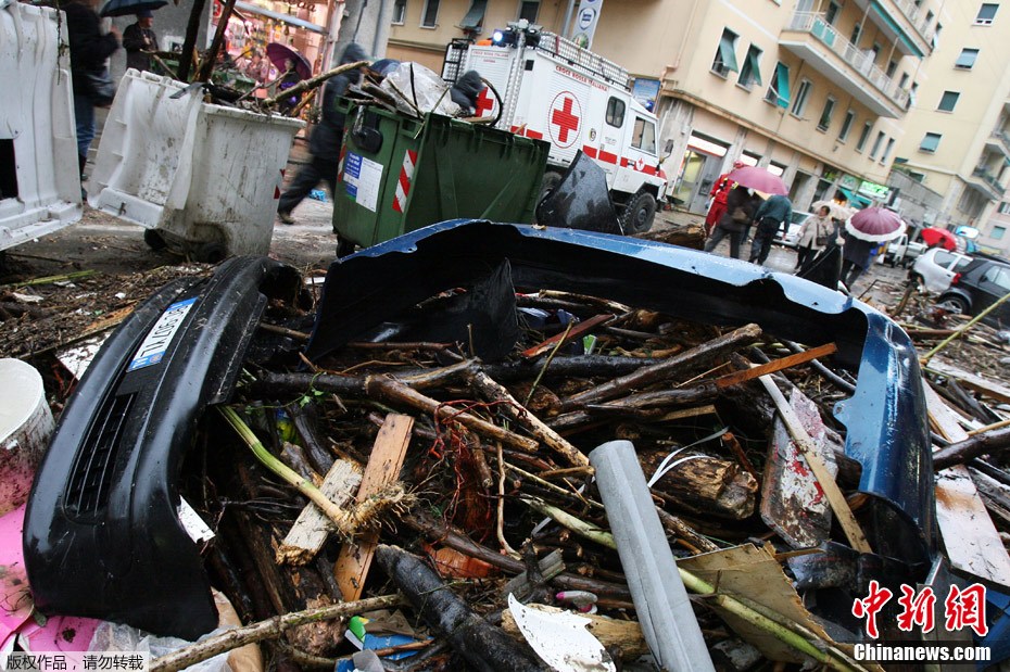 當地時間2011年11月5日,意大利熱那亞,暴雨過后,街道上遭毀壞的汽車堆積如山。意大利北部城市熱那亞4日起遭暴雨襲擊,在部分城區引發洪水,已導致多人死亡。