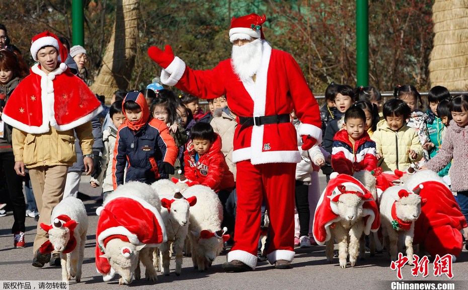 當(dāng)?shù)貢r間2011年11月24日,韓國龍仁市,圣誕老人領(lǐng)著換上圣誕裝的小羊羔游行。