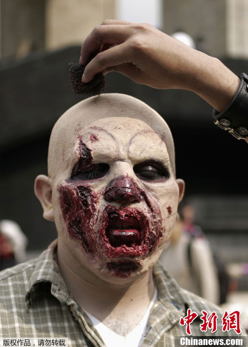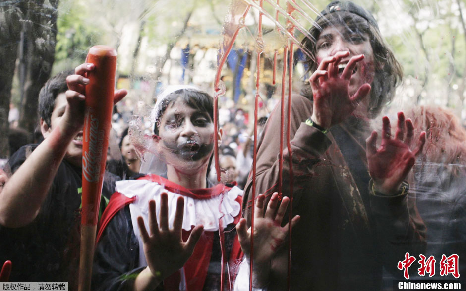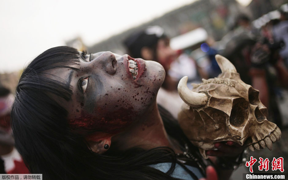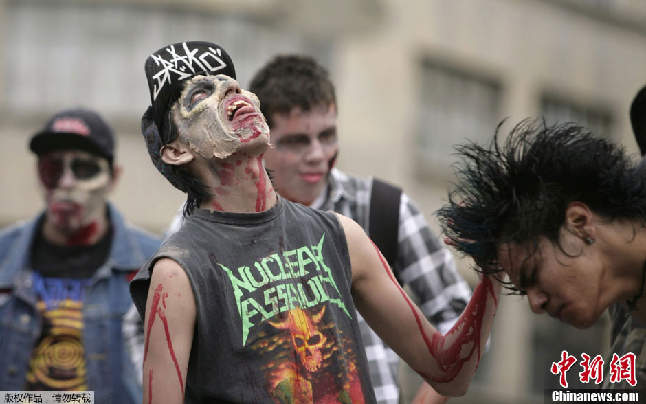當地時間11月26日,墨西哥民眾舉行“僵尸大游行”,近萬人裝扮成各式各樣的“僵尸”在廣場上聚集。登記參加這次大游行的人共有9860人,主辦方期望打破僵尸游行最多參與人數的吉尼斯世界紀錄。